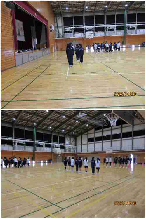 体育館では、3年生と1年生が体育の授業で集団行動に取り組んでいました。3年生はすでに実際の動きを交えながら練習を進めており、1年生は基本的な動きやルールの確認をしていました。