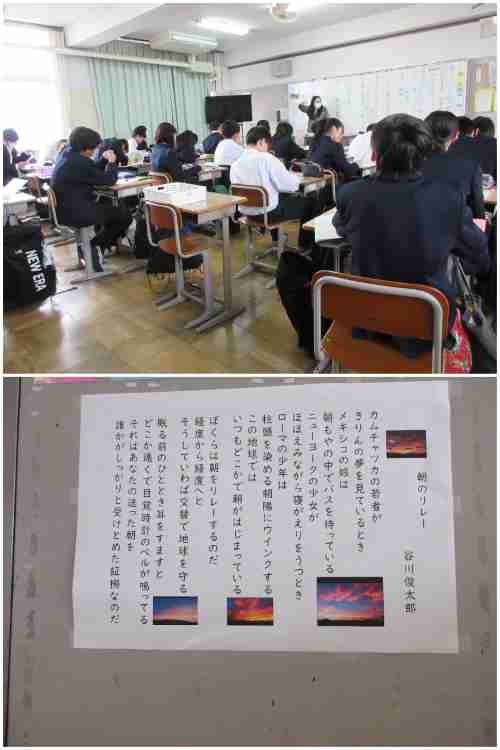 授業では、「朝をリレーする」という表現がどのような意味を持つのかを考えました。生徒たちは、時差によって朝がバトンのように受け渡されていくイメージから、「世界中の人々が見えないところで地球を守っている=支え合っている」という作者の思いを読み取っていました。