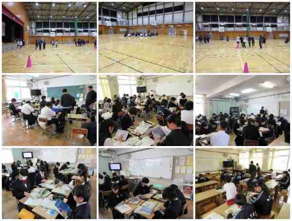 今日の午後の授業の様子です。体育館では、1年生と2年生が体育の授業に取り組んでいました。1年生は集団行動の練習を行い、2年生はスポーツテストに挑戦していました。最初に前屈の測定があり、説明を聞きながらポイントをしっかり確認していました。