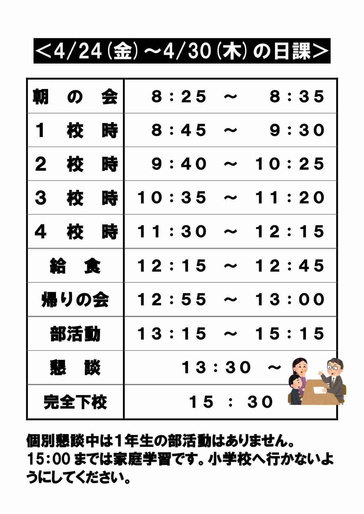 なお、個別懇談期間中は1年生の部活動はありません。部活動のない生徒は、15時まで自宅学習となります。日課の確認をよろしくお願いします。