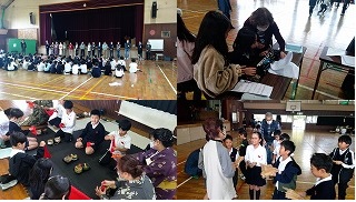 3年生は総合的な学習の時間に『真野の名人さんに学ぼう』と題して、地域の方々からさまざまな技を教えていただきました。子どもたちは、大正琴、茶道、玉すだれ、手芸、書道、ウクレレ、ことば遊びの7つのグループに分かれ、それぞれの技に挑戦しています。今日教わったことをこれからさらに磨き、後日、名人さんに成果を見ていただく予定です。地域の方との温かいつながりの中で、子どもたちは意欲いっぱいに学んでいます。