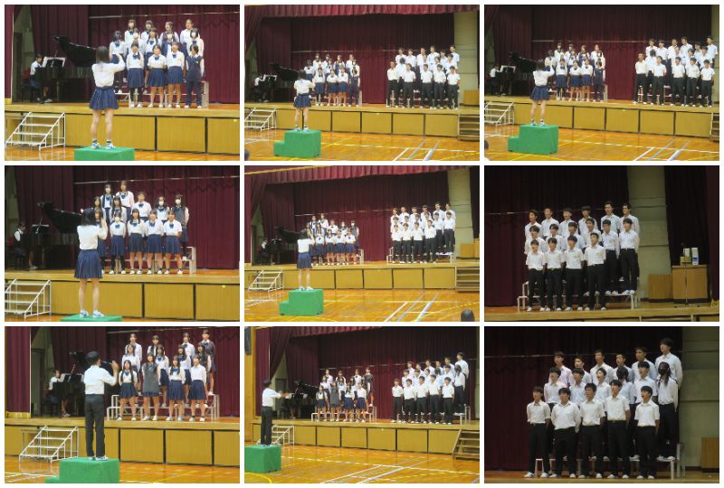 昨日の4時間目に2年生の合唱コンクールプレ発表会がおこなわれました。プレ発表会は本番同様、合唱実行委員委が司会進行をしてくれました。 プレ発表前に学年主任の先生から、「合唱を何のために歌うのか。聞いている人に何を伝えるのか」と問いかけがありました。「指揮者と伴走者の人はクラスの歌を最大限引き出してほしい」と話がありました。 順番は3組 時を越えて、 1組 旅立ちの時〜Asian Dream Song〜 、2組 HEIWAの鐘でした。どのクララスもとても良い感じです。1年生の時よりも少し大人になった声で、強弱を大切しながら歌いました。伴奏者も指揮者もレベルアップしています。クラスの歌が終わった後、男子が「間違えてしまった」や「少し早くなりすぎた」等、反省している姿に成長を感じました。 プレ発表会で他のクラスから刺激ももらったと思います。最高の練習をして最高の歌声を体育館に響かせてください。そして、2年生は合唱コンクールの先頭バッターです。今日の勢いで合唱コンクールの雰囲気をつくってください。