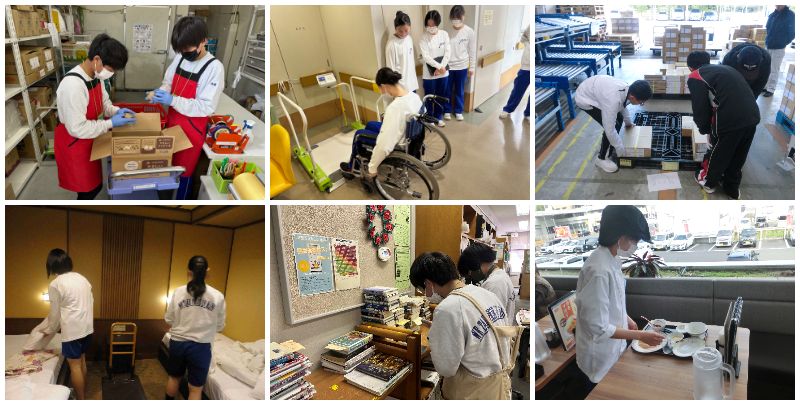 ○郵便局 … 手書きの年賀状づくりやはんこ押し、チラシ折りなどに挑戦。かわいらしい年賀状は窓口に貼られ、来客の目を楽しませていました。 ○スーパー … 品出しや補充を任され、少なくなった商品をメモをとりながら確実に並べていました。少しずつ仕事が様になってきています。 ○幼稚園・保育園・こども園 … 園児と一緒にしっぽ取りで走り回ったり、チューリップの苗植えをしたりと、笑顔があふれる活動を体験しました。「子どもがかわいい」「楽しい」との声もたくさん聞かれました。 ○飲食店・ファーストフード店 … 水や料理を渡す、調理場で下準備をする、食器を片付けるなど、それぞれの役割をしっかり果たしていました。昼時には戦力として活躍し、ポテト揚げやホール清掃にも取り組みました。 ○スイーツ店 … クッキーの仕込みを行い、翌日には焼いて販売予定。最終日にはホールケーキづくりにも挑戦します。 ○小売店 … 納品されたジャガイモの芽を丁寧に取り除く作業を黙々と続けていました。 ○病院 … 車いすの操作体験を通して、利用者の立場に立った学びをしました。体重計に車いすを入れる作業は難しそうでした。 ○配送関連 … 商品の仕分けや運搬をテキパキと行い、「積極的でとてもありがたい」と評価されました。