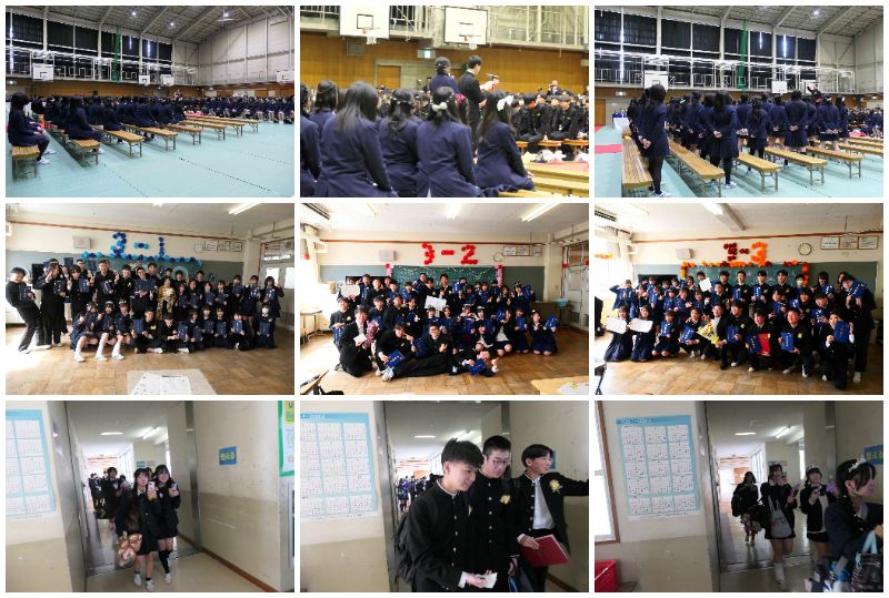 第38回卒業証書授与式が在校生・保護者・来賓・本校職員が出席して盛大に行われ、良い緊張感がある感動的な卒業証書授与式になりました 全校生徒による校歌斉唱はとても勢いがあって聴き応えがありました。続いて、卒業証書授与。担任の先生の呼名に想いのこもった返事をして卒業証書を受け取りました。式辞の後、3年生への感謝の気持ちを表した在校生のことば。3年間の仲間との想い出、家族への感謝を語った卒業生のことば。感動的な場面が続きました。 3年生の合唱「正解」。若者の悩みや葛藤、未来への不安と希望をテーマした曲。ボリュームのあるきれいなハーモニーが体育館に響き渡りました。来賓のみなさんも絶賛でした。 最後は式歌合唱「旅立ちの日に」。3年生の迫力ある歌声、それに負けないぐらい1・2年生も3年生への感謝の思いを込めて歌いました。先輩の頼もしい立派な背中を1・2年生にしっかり見せてくれました。 卒業式の後はクラスに戻り担任の先生から卒業証書を受け取りました。続いて、クラスでの卒業セレモニー。仲間や担任の先生との別れを惜しむ涙がたくさんあふれていました。最後は笑顔でクラス写真。そして、1・2年生が花道をつくり卒業生を温かく送り出してくれました。生徒昇降口では担任の先生、3年生の先生に感謝の気持ちを伝える3年生には涙と笑顔が入りまじっていました。晴れやかな笑顔で未来に向けて真野中学校を巣立っていきました。 私は入学してから真野中学校で日に日に成長していく三年生のみなさんの姿を三年間頼もしく見つめてきました。三年生はエネルギッシュで、パワフル、そしてとてもフレンドリーでした。いつも明るく大きな声であいさつをしてくれたり、写真を撮りに行くと満面の笑顔で気軽に応じてくれたり、校長室をのぞいて温かな声をかけてくれたり、とても親近感が湧きました。時には持ち前の元気さが勢いよくあふれ出る場面もありましたが、当たり前のことを当たり前に、真面目にきちんと取り組むことのできる生徒が多くいてくれたことは、学年が大きく崩れない確かな力となりました。 修学旅行は2泊3日で関東方面に向かいました。行き帰りの新幹線で友との語らいやカードゲームで盛り上がった楽しい時間。バスで東京プチ観光を楽しみ仲間との交流を深めたクラス別学習。高層ビルの多さに圧倒された東京スカイツリーからの景色。計画した訪問場所、昼食場所を周り想定外のハプニングに見舞われながらもみんなで協力して集合場所にたどり着いた探究学習。仲間とともに笑顔いっぱいでいくつものアトラクションを満喫した東京ディズニーランド。東京の文化や最先端の技術に触れ新しい発見ができた体験学習。クラスの仲間と夜遅くまで語り合い笑い合ったホテルでの時間。忘れられないたくさんの思い出が残りました。