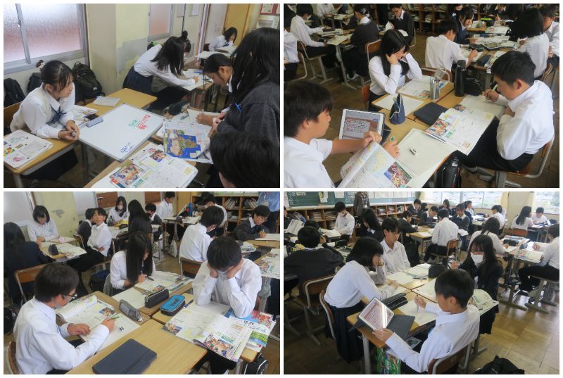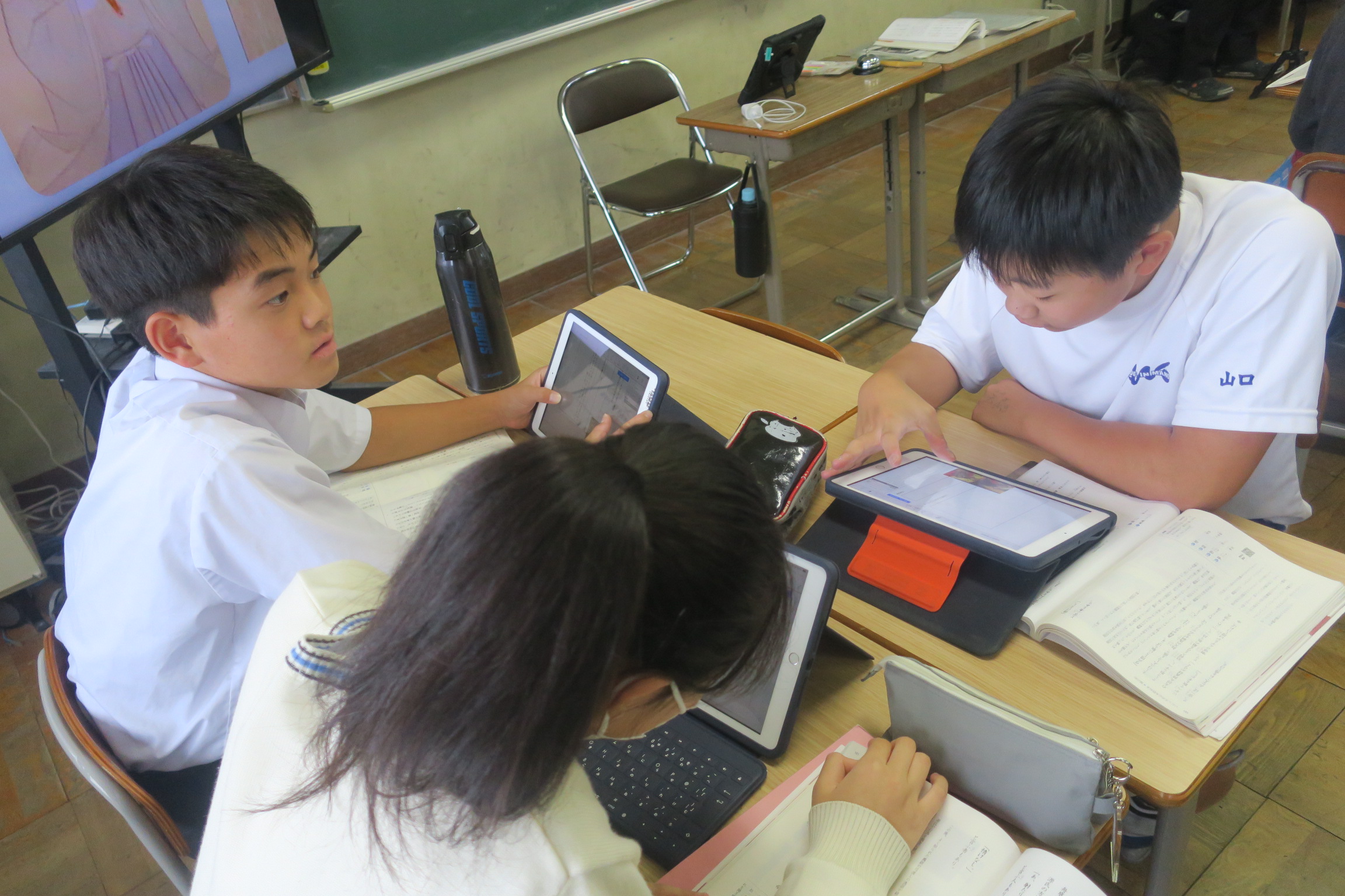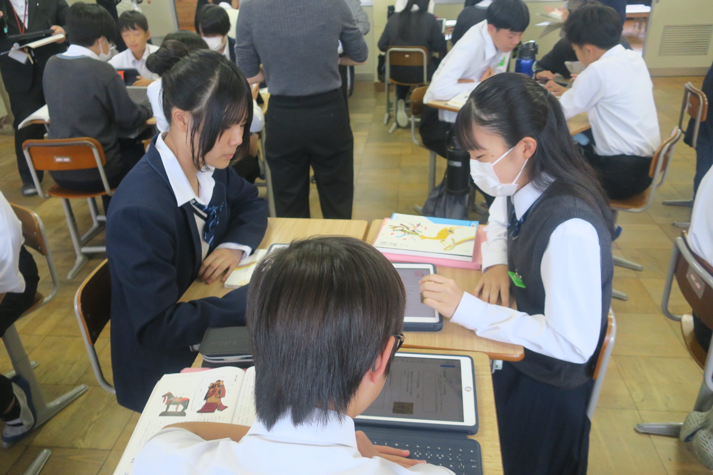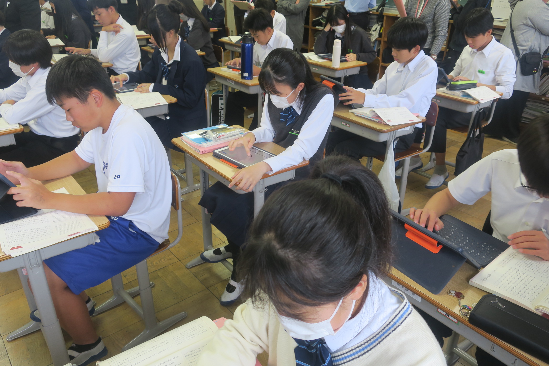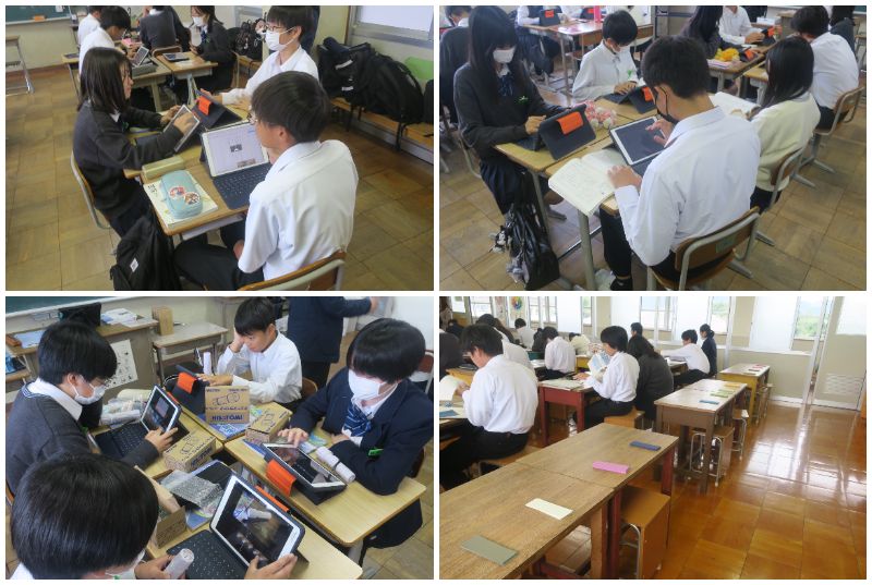 今日は朝から肌寒い1日です。時々時雨もあり雲が多い天気で気温がほとんど上がっていません。今日は寒いです。エアコンを冷房から暖房に入れ替えました。「暑い」と言っていたのがずいぶん前のように思います。今日の3時間目の授業の様子です。2年1組の国語の授業は「平家物語」でした。登場人物のエピソードを文章で表す課題に取り組んでいました。2年2組は技術の授業でした。自分たちでつくったチューブライトkCM紹介をMetamojiで作成する作業に取り組んでいました。