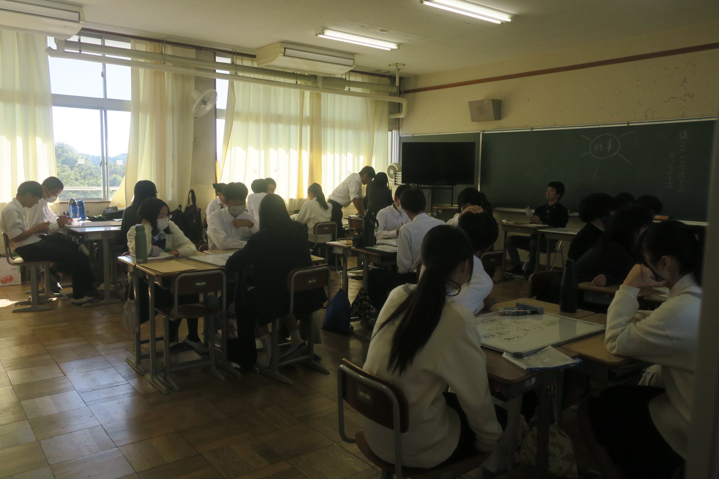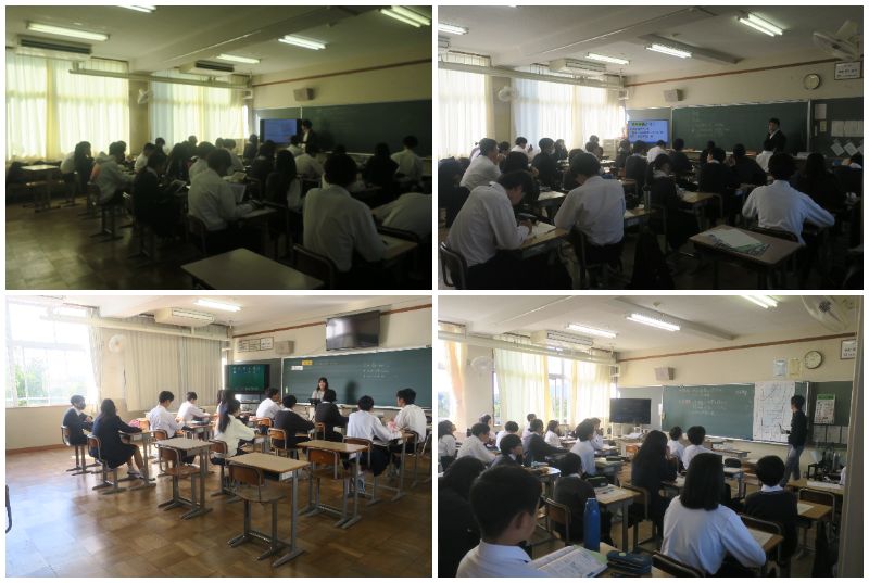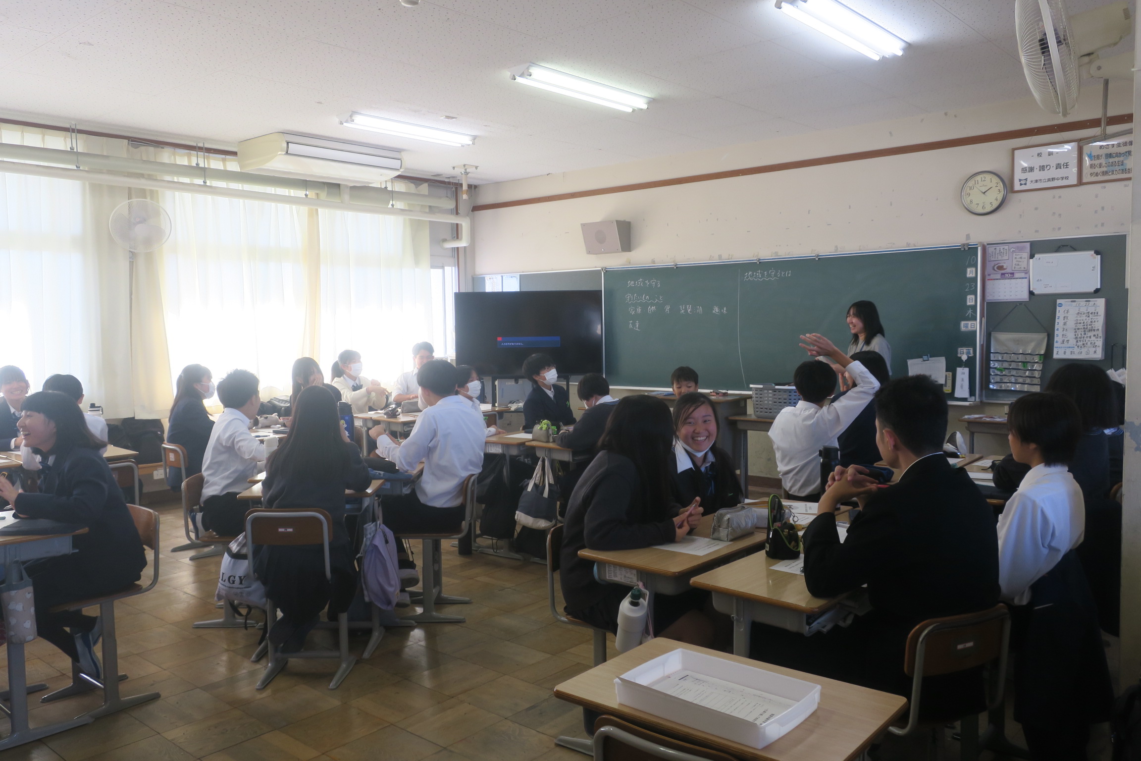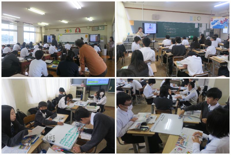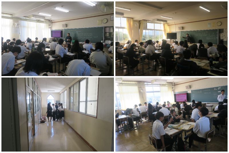 1年1組は英語の授業でした。代名詞の使い方について英文をもとに確認していました。1年2組は社会の授業でした。アフリカ州の学習でした。「南アフリカ共和国のラグビー代表がどうして白人が多いのか?」という課題にグループで取り組んでいました。