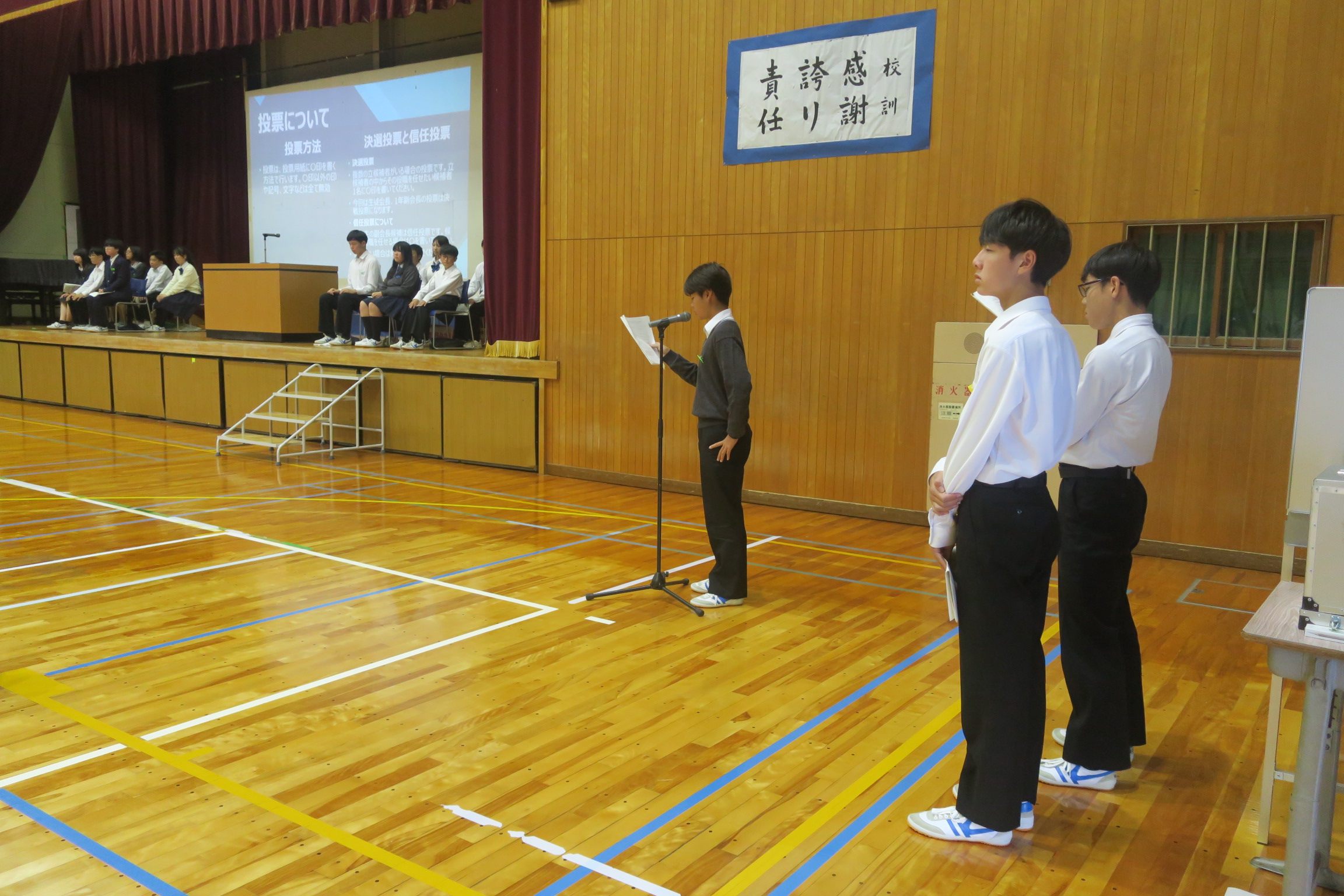 真野中生の次のリーダーを選ぶ大切な選挙です。6時間目の立候補者と応援弁士の演説をしっかり聴いて、公約や熱意、人柄を十分見極めてら帰任ある「清き一票」を投じてください。