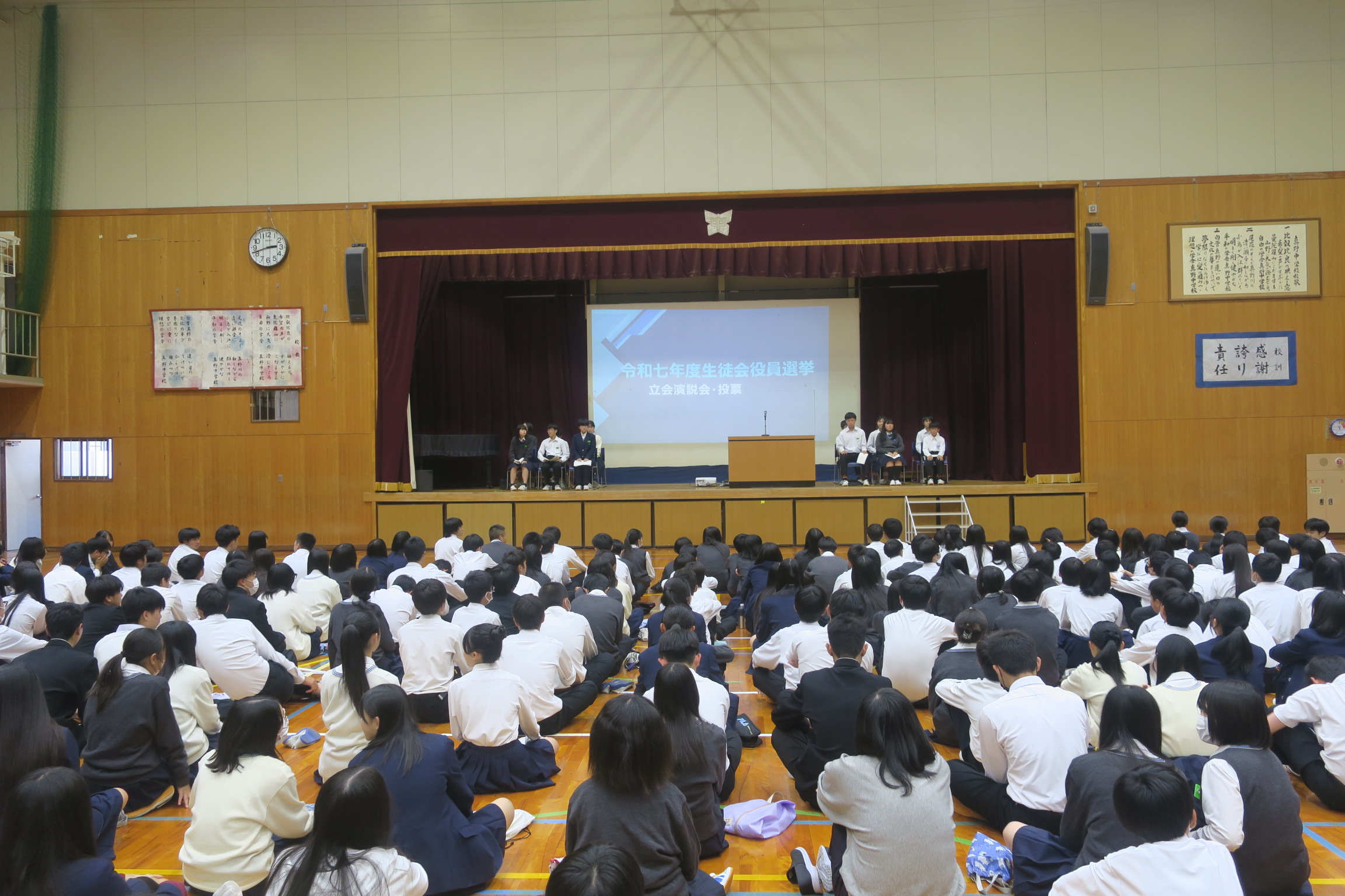 昨日は生徒会立会演説会お疲れさまでした。演説する側も聴く側もとても良い雰囲気で行うことができた立会演説会でした。お疲れさまでした。いよいよ、今日の朝、結果が発表されます。自分たちが選んだ生徒会のリーダーをみんなで支えてあげてください。今日は6時間日課。部活動の完全下校は16時45分です。駅伝のメンバーは17時15分になります。活動時間は短いですが、1分1秒大切にして質の高い練習をしましょう。