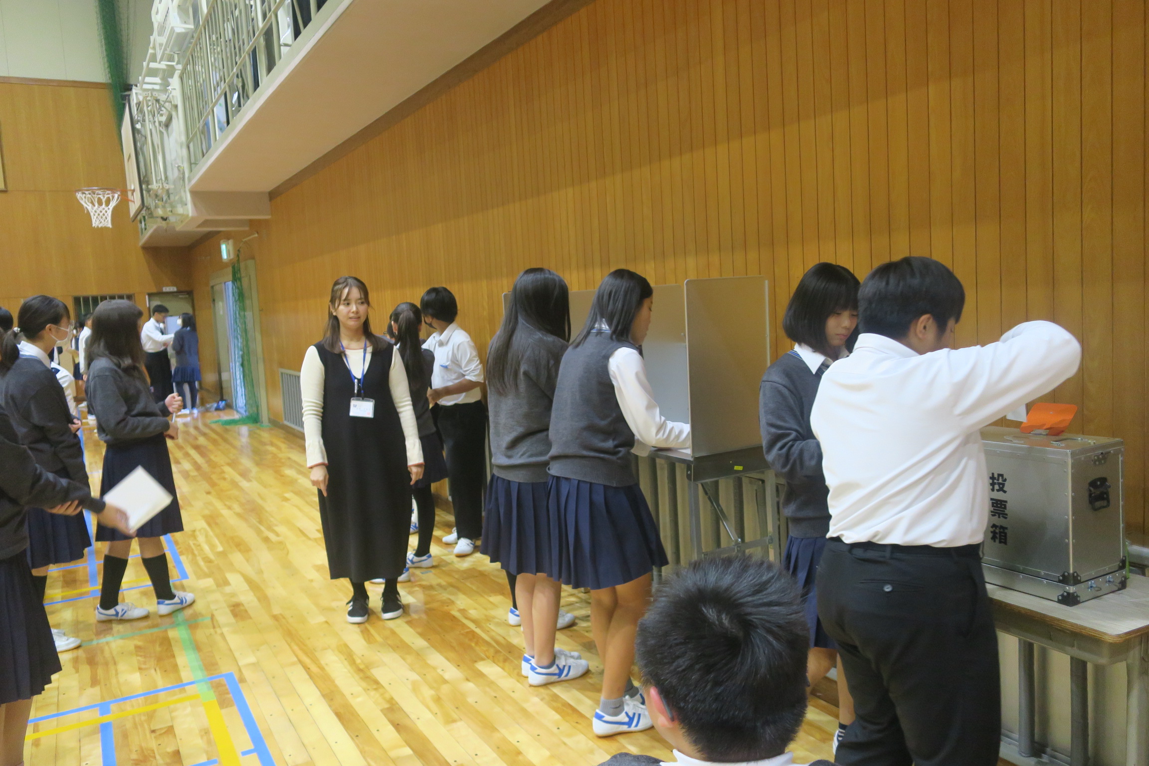 今日は6時間日課です。部活動の完全下校は16時45分です。今日は6時間目に生徒会役員選挙立会演説会・投票が行われます。月曜日から選挙運動が始まり日に日に活動が熱を帯びています。自分の名前と一緒に「清き一票をお願いします。」という声がたくさん聞こえてきます。