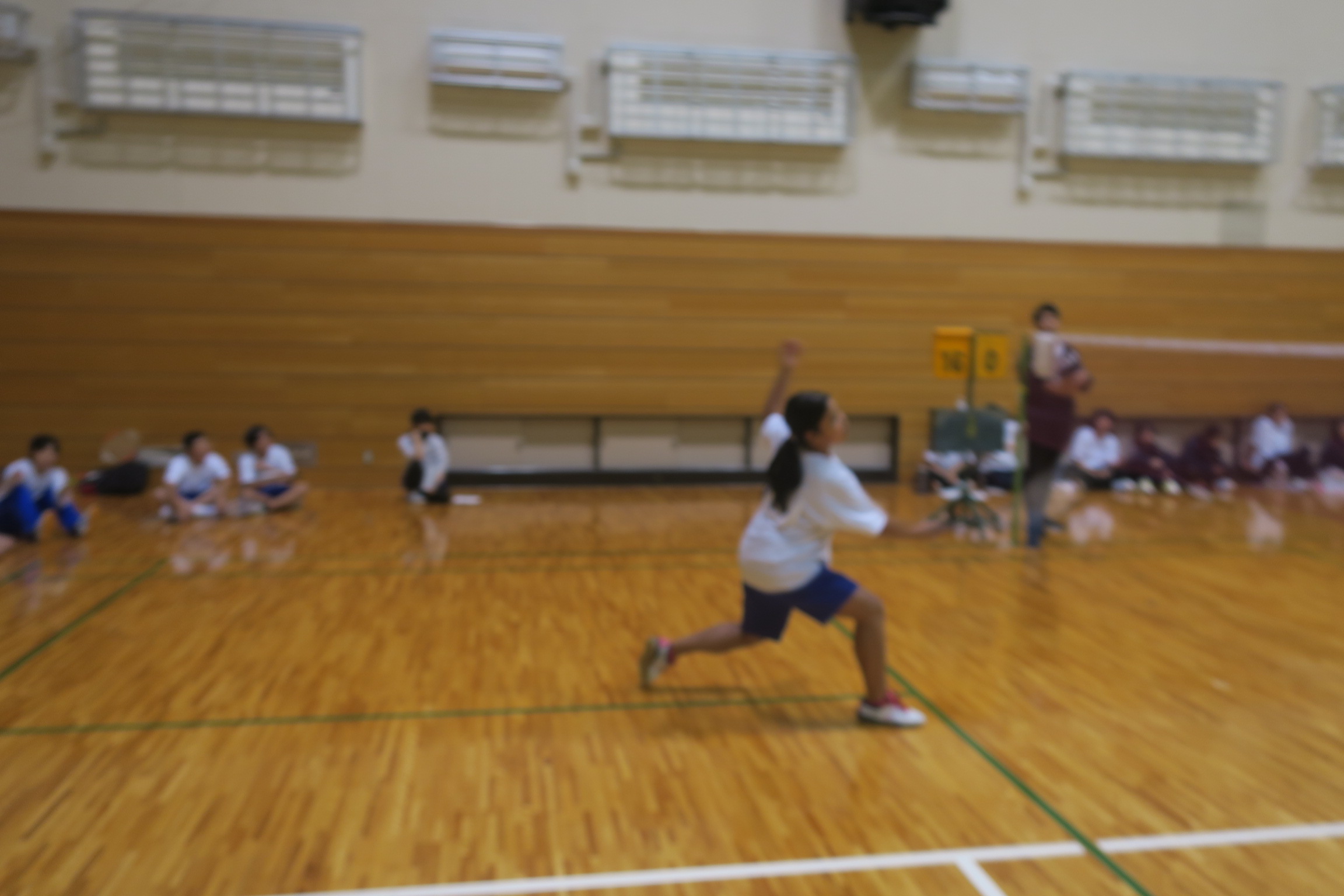 今日は朝から皇子が丘公園体育館で大津市交歓スポーツ交流会が行われています。真野中学校からも8名の生徒が参加しています。競技種目は卓球、バドミントン、ボウリングのは3種目です。真野中学校の8人はバドミントンに出場しています。みんな楽しむと言いながら、けっこう真剣にやっています。ラリーも続いています。試合に出場している選手をみんなで応援しています。負けると悔しがっています。