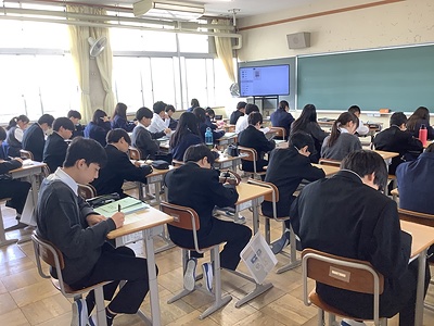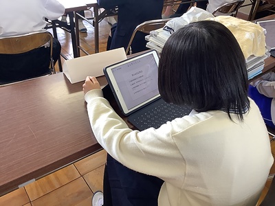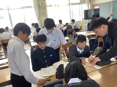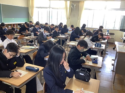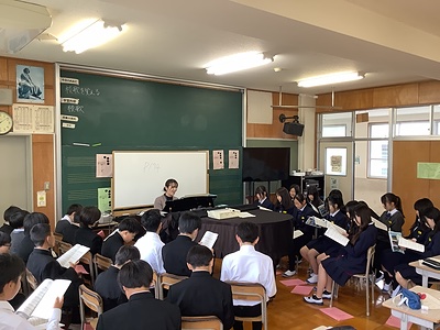 1年3組は音楽。『旅立ちの日に』、『Believe』を合唱した後、真野中校歌を練習していました。早く覚えてくださいね。