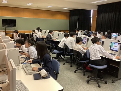 2年4組は技術。プレゼンテーションソフトの使い方を学んでいます。真野中ホームページの素材を使って、スライドを制作していました。(見てる人もいるかな?)
