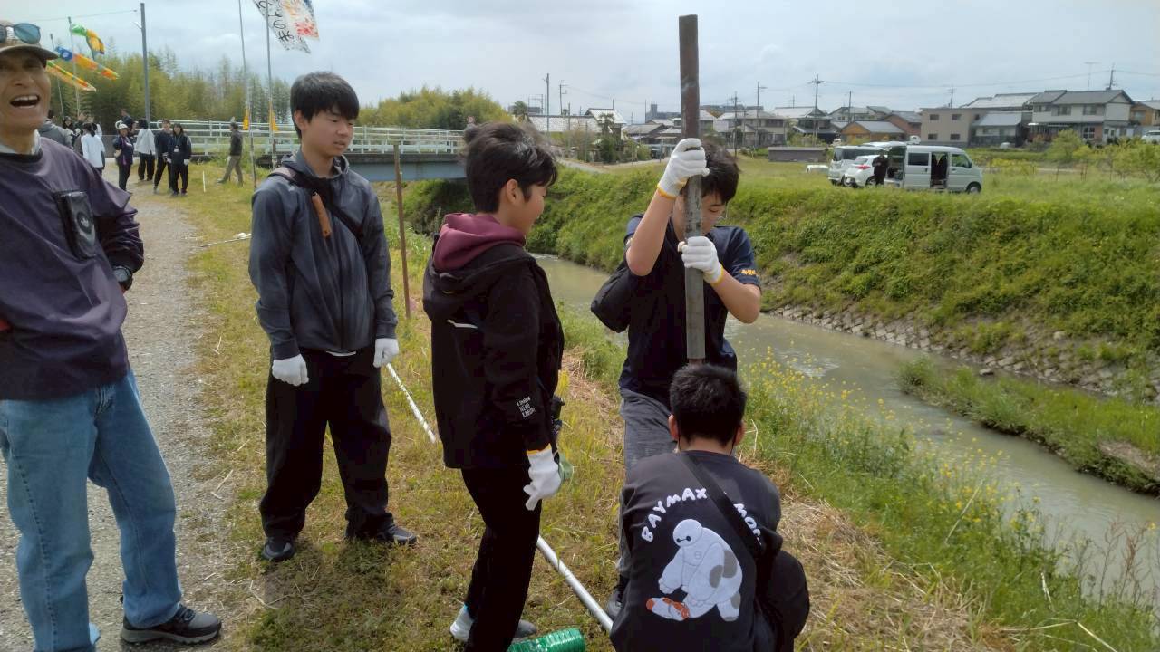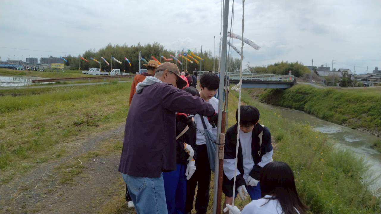 地域の方々と一緒に、真野川の堤防に杭を打ち、ポールを建て、鯉のぼりをつけました。みなさんの協力のおかげで、約1時間で計50匹の鯉のぼりが空に泳ぎだしました。