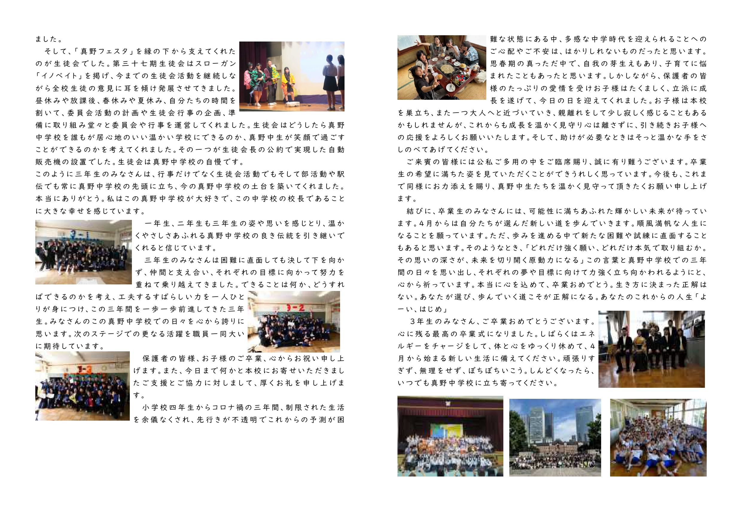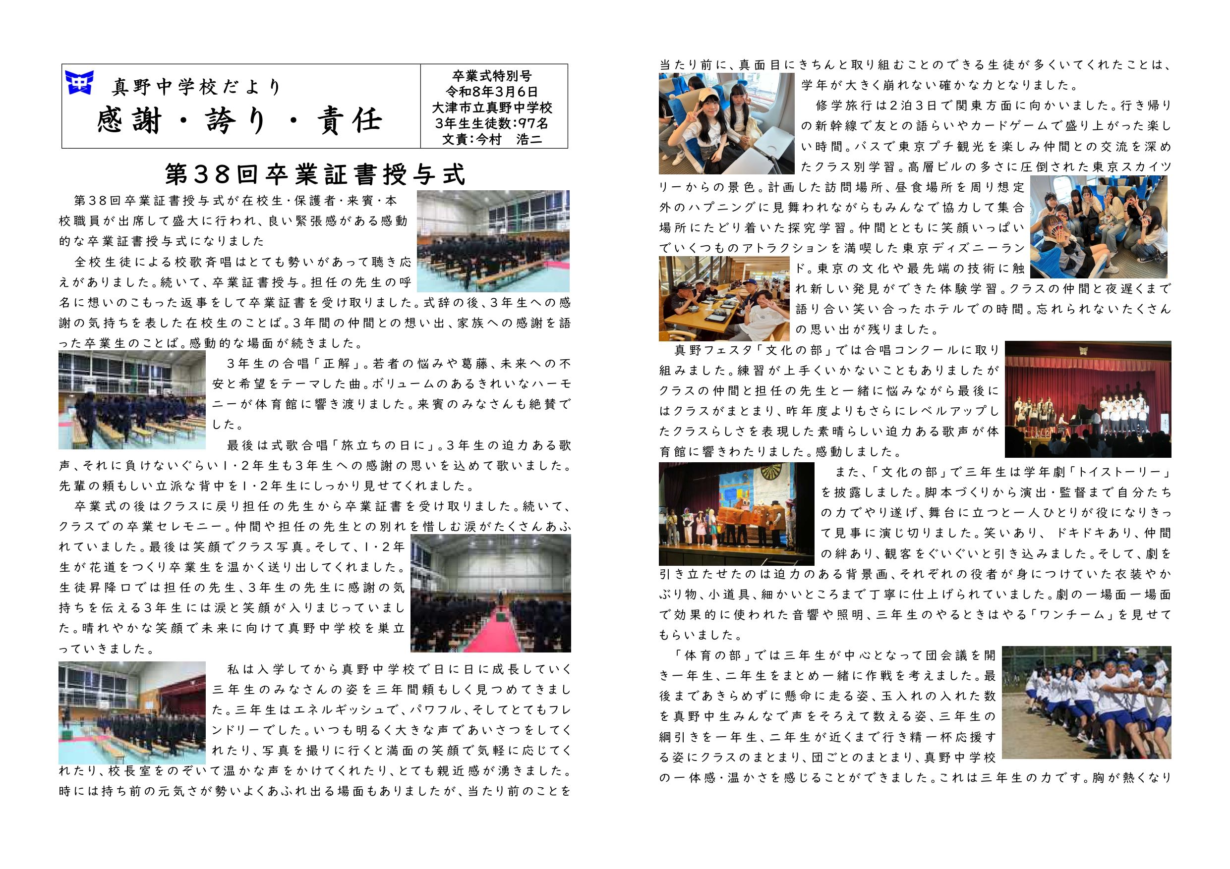 真野中学校だより「卒業式特別号」を発行しました。ご一読をお願いします。3年生のみなさん、ご卒業おめでとうございます。心に残る最高の卒業式になりました。しばらくはエネルギーをチャージをして、体と心をゆっくり休めて、4月から始まる新しい生活に備えてください。頑張りすぎず、無理をせず、ぼちぼちいこう。しんどくなったら、いつでも真野中学校に立ち寄ってください。