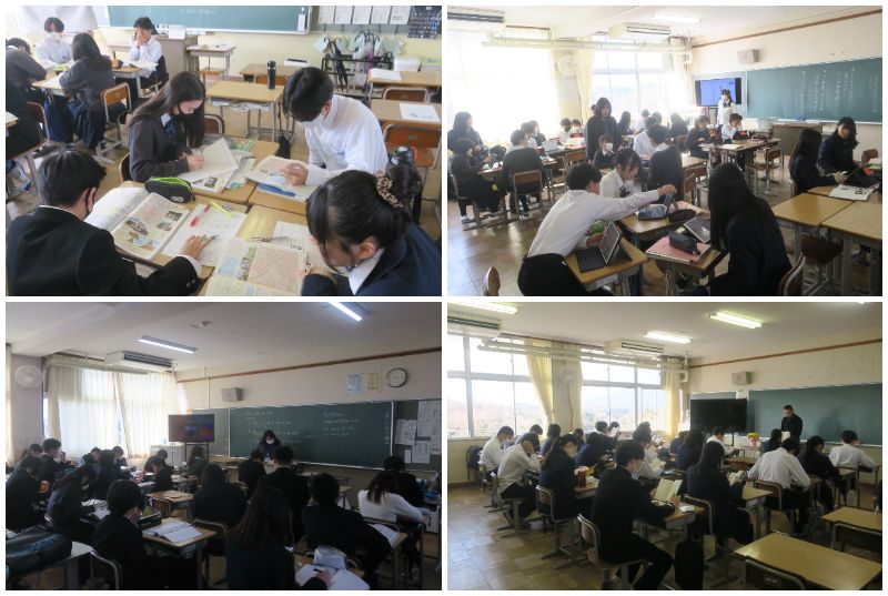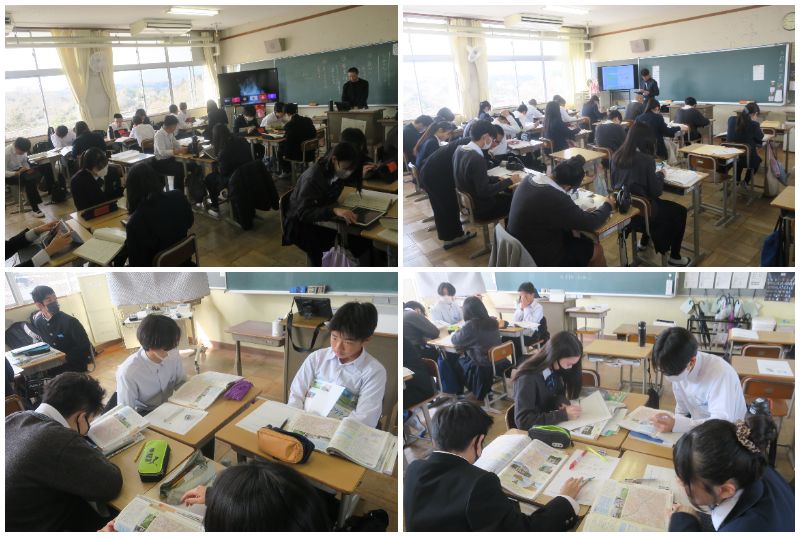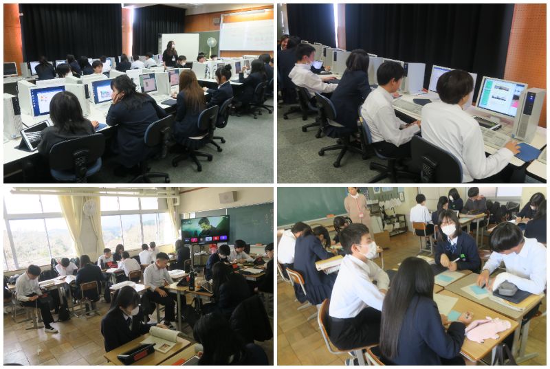 2年1組は英語の授業でした。デミアン先生へのメッセージカードづくりに取り組んでいました。2年2組は国語の授業でした。「モアイは語る」の内容を世かりやすく説明するプレゼンづくりに取り組んでいました。2年3組は理科の授業でした。これまで学習してきた『天気』のまとめとしてホークの問題に取り組んでいました。
