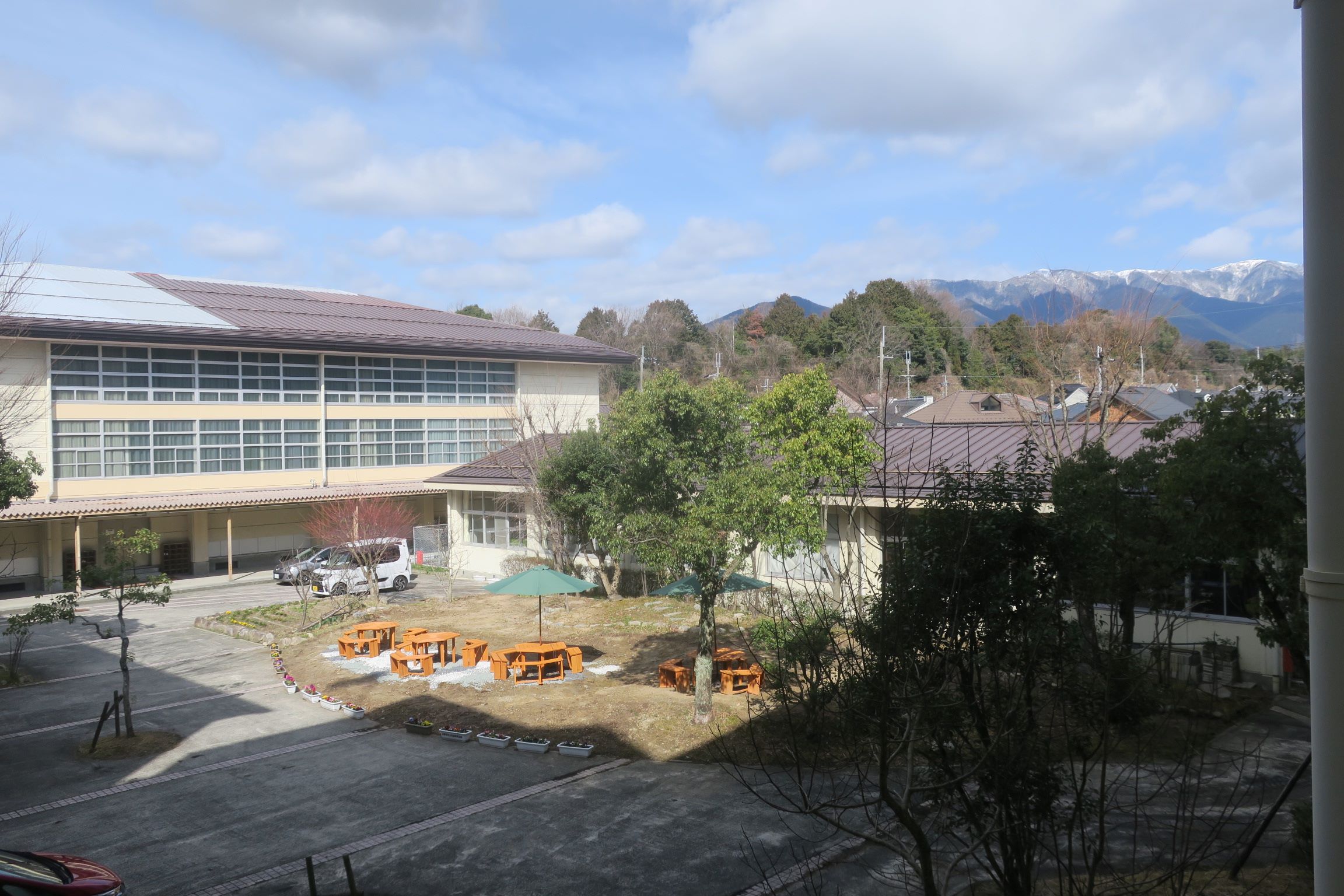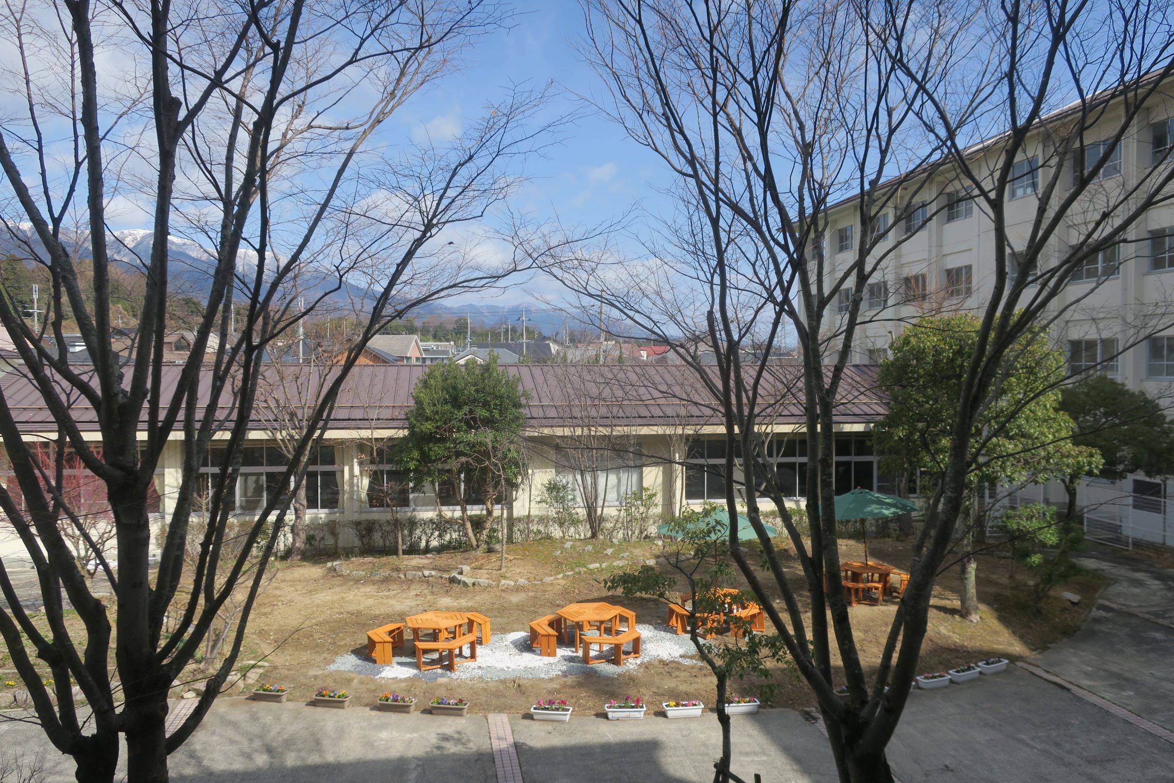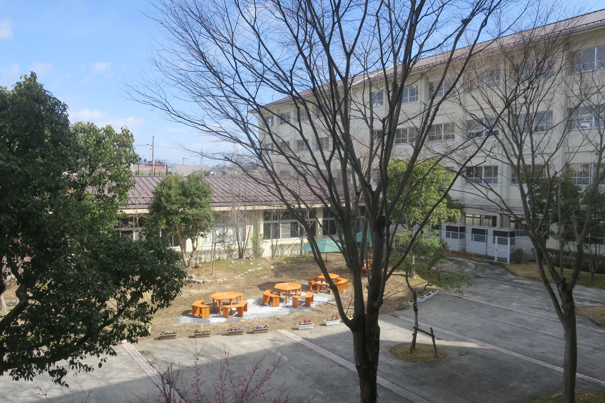 使用できなくなっていたビオトープ装置の撤去や土地改良工事を進めていただきました。真野北学区社会福祉協議会 会長さん、13個のプランターに花の苗を植え、中庭の周囲に設置していただきました。卒業式前日には砂利をしき、4つのパラソルつきベンチを設置し、ついに新しい「中庭」が完成しました。
