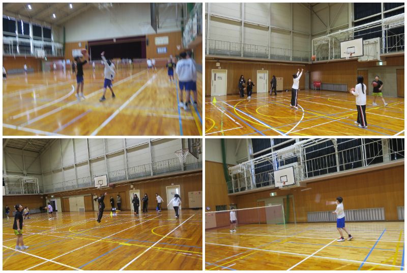 男子バスケットボール部は2対1の練習に取り組み、数的優位の状況でどのようにシュートまでつなぐかを試しながら練習していました。 女子バスケットボール部はセンターでパスを受けた選手がゴールへ向き直り、シュートを放つ動きを繰り返し練習していました。