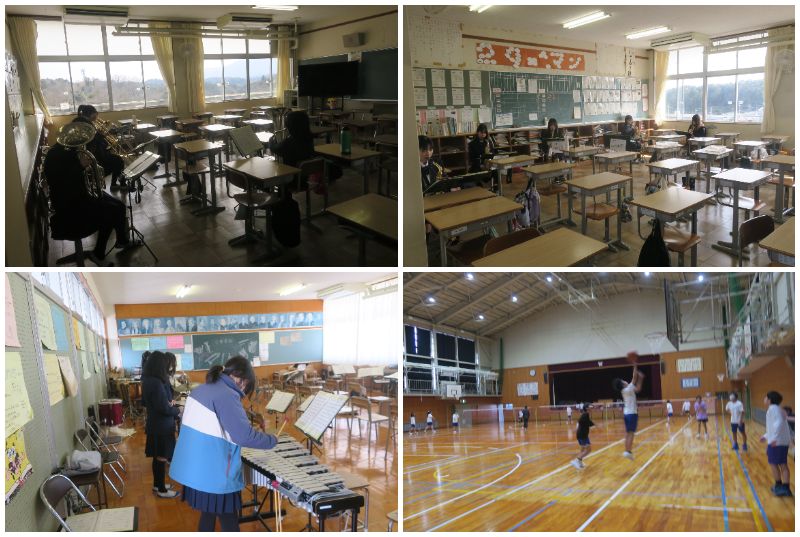 今日から午前中日課となり、午後は部活動の時間になります。13時25分に帰りの会が終わるため、13時30分から15時00分までが活動時間となり、部活動完全下校は15時15分です。限られた時間を大切にし、集中して練習に取り組んでください。吹奏楽部は今週土曜日に行われる大小吹に向けてパート別練習を進めており、先週の土曜日には堅田中学校との合同練習会も行いました。本番に向けてラストスパートをかけてください。卒業式では入退場曲の演奏も担当してくれました。お疲れさまでした。