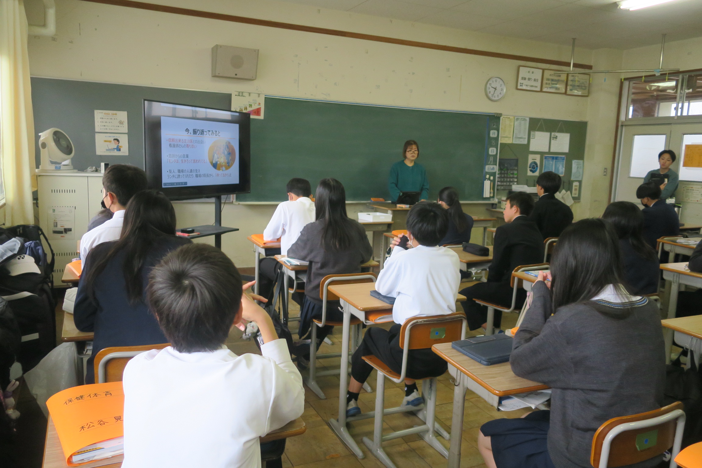 今日の1時間目から3時間目にかけて、「滋賀県がん教育スピーカーバンク」から講師の方をお招きし、がん教育を行いました。まずは動画を通して「がんの知識」について学び、病気のしくみ知識や予防の大切さを学びました。続いて、実際に「がん」を経験された講師の方から直接お話を伺いました。友人の死をきっかけに検診を受けて「がん」が見つかったこと、手術や治療を受ける中で心がとても苦しかったこと、しかし家族や周りの支えが大きな力になったことなど、体験にもとづいた言葉は私たちの心に深く響きました。