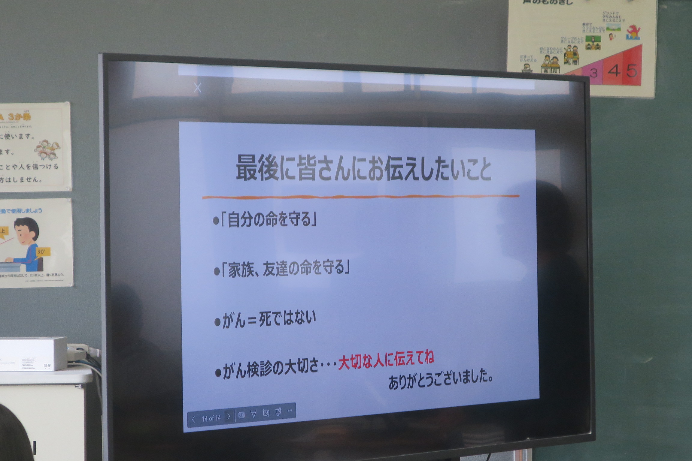 講師の方は、「私たちの一番大切な命を守るために、健康を第一に考えた生活習慣を心がけること」「定期的な検診を受けること」「周りの支えを大切にすること」が重要だと強調されました。