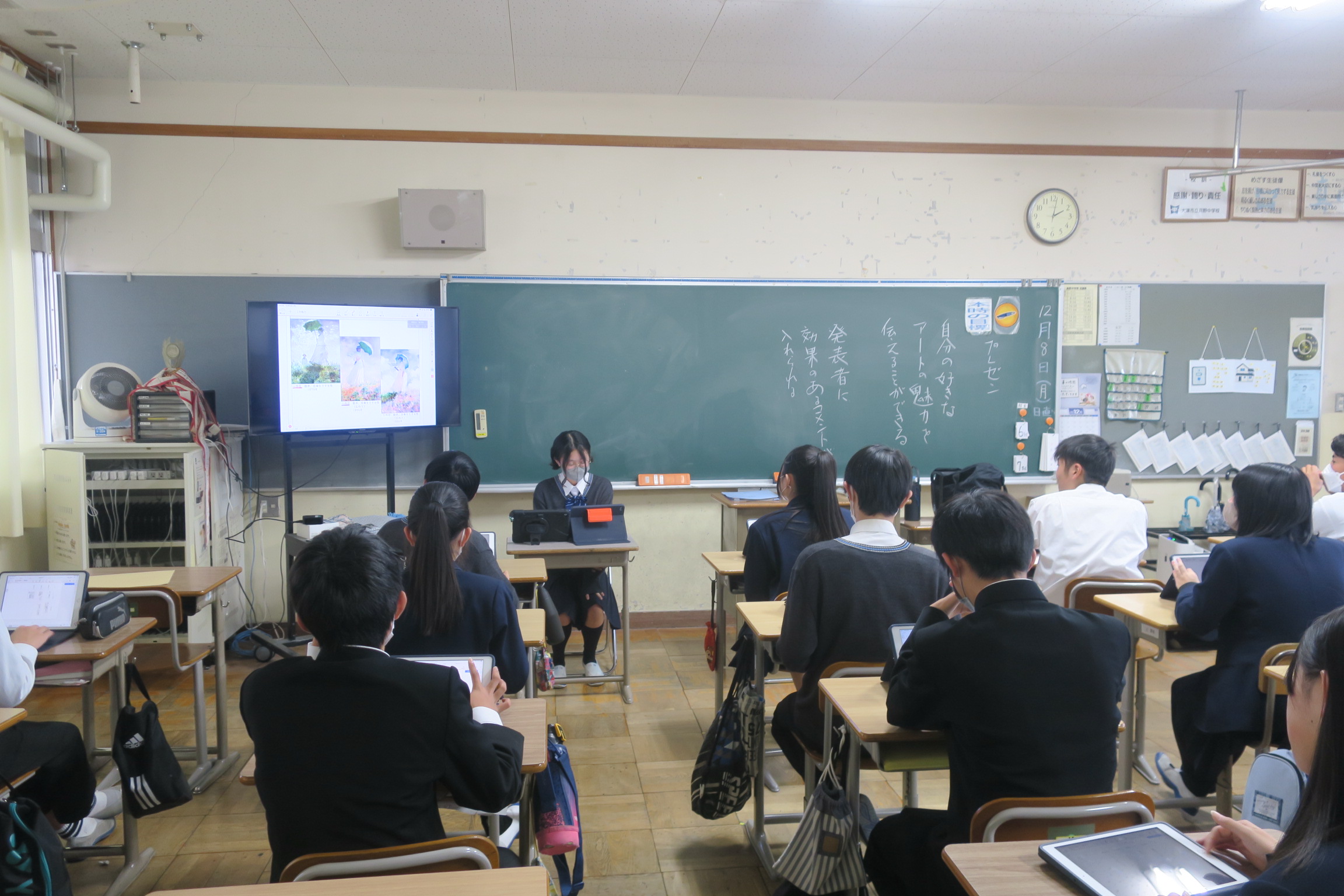 2年生の国語の授業では、プレゼンテーションに力を入れています。今回のテーマは「自分の好きなアート(絵画)」を選び、その魅力についてまとめ、クラスの仲間に発表するという内容でした。発表者は最後に選んだ絵画に、自分の考えたテーマを名づけることで、作品への理解や思いをさらに深めていました。聴いている生徒は「聴衆者」として、それぞれの発表にコメントを書き込み、発表者にフィードバックを送りました。発表者と聴衆者が互いに学び合う場となり、授業全体が活気にあふれていました。
