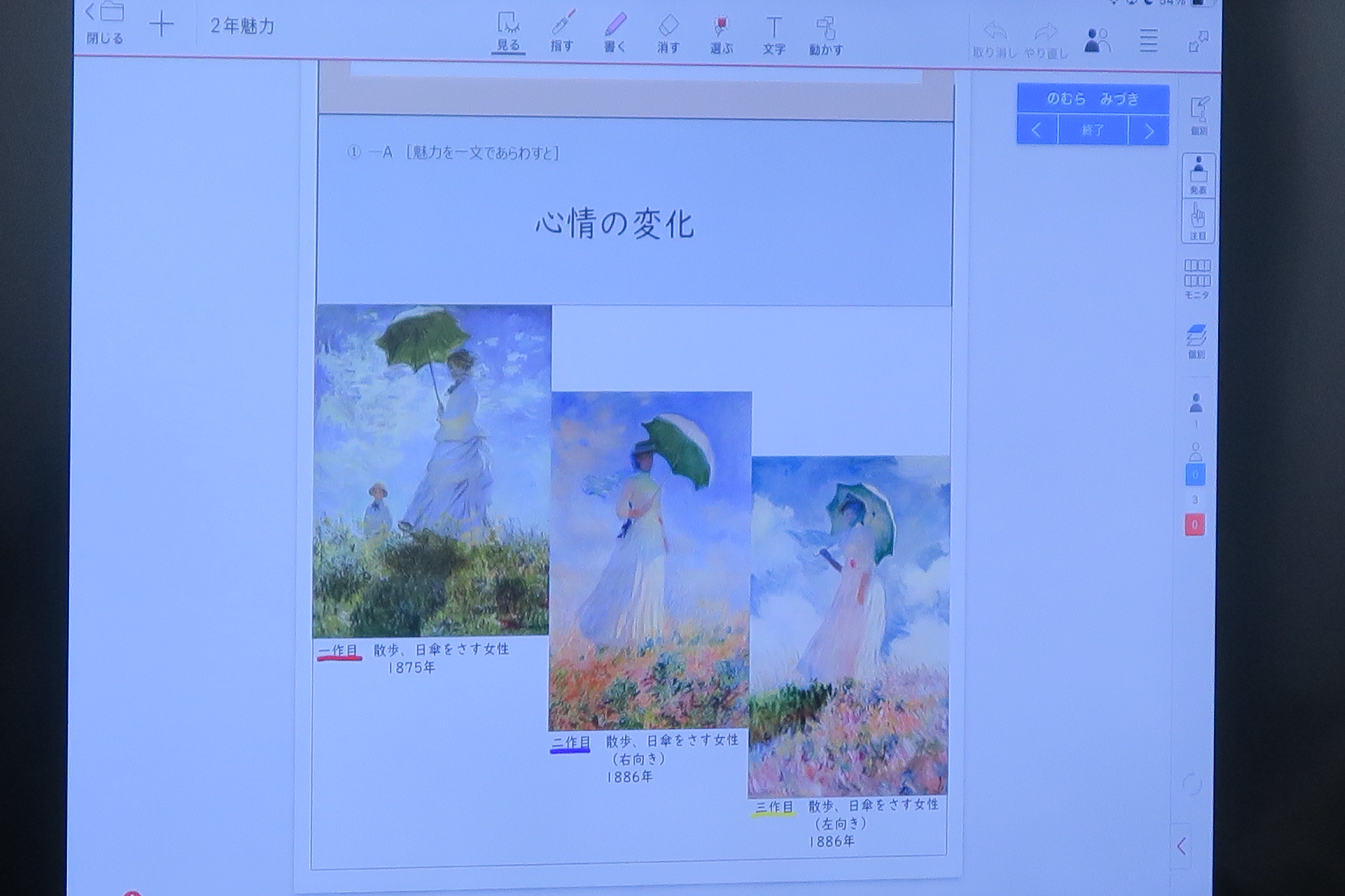 今日の発表では、クロード・モネの代表作「日傘の女」と「睡蓮」(すいれん)が取り上げられました。どちらも印象派を代表する作品ですが、発表者はそれぞれの視点から作品の魅力を分かりやすく伝えていました。光や色彩の美しさ、自然の中で感じる風や空気感など、モネが描いた世界を自分の言葉で表現し、聴いている側にもその魅力が伝わってきました。