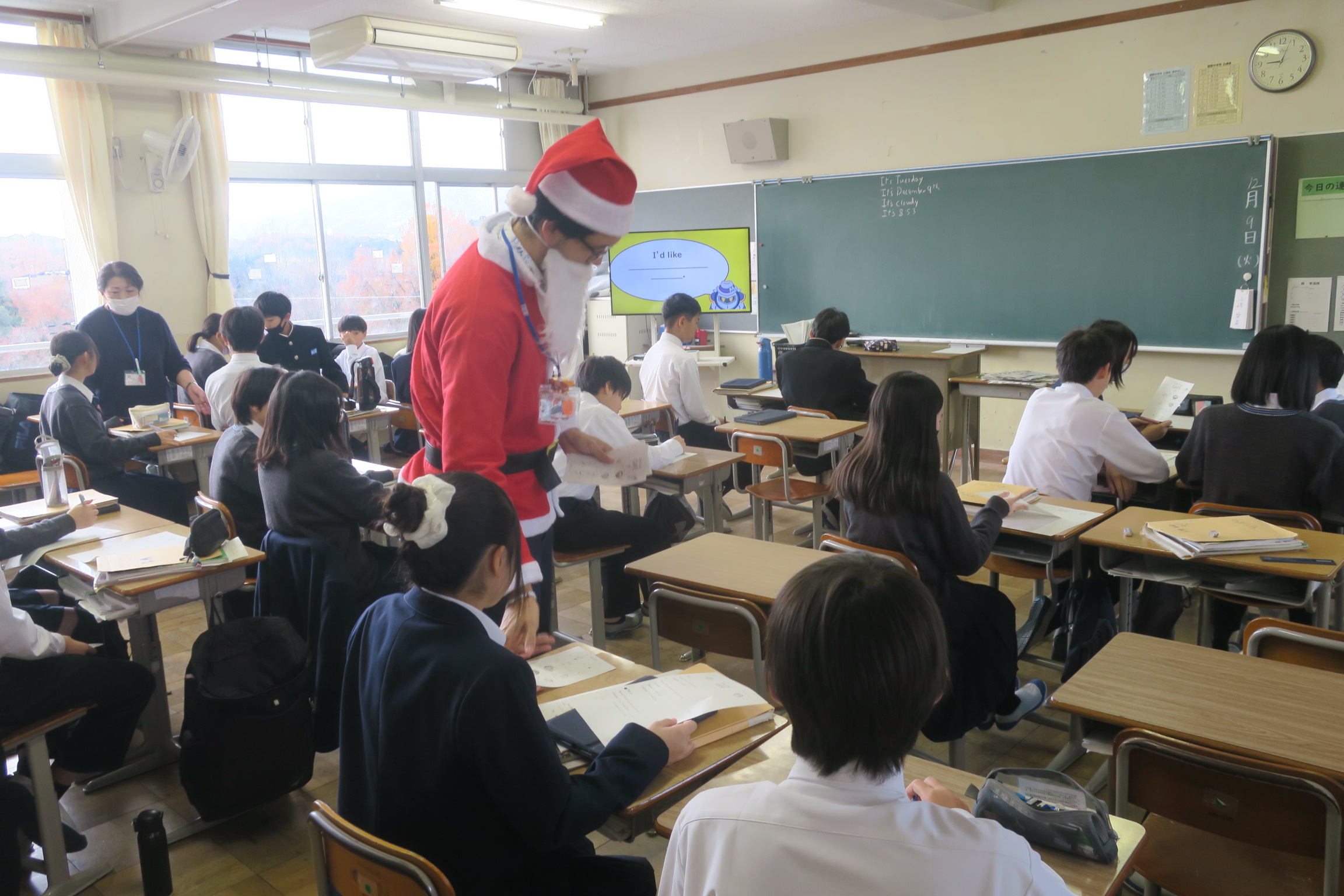 朝から寒気が流れ込み、時雨模様の一日となりました。空は厚い雲に覆われ、気温もそれほど高くなく、昼間も寒さが続く予報です。そんな冬らしい空気の中、校舎内では子どもたちが落ち着いた雰囲気で学習に取り組んでいました。1時間目の授業の様子です。1年4組は英語の授業でした。ALTの先生がサンタクロースになりきって登場し、子どもたちの笑顔を引き出しながら授業を進めていました。「Would you like 〜?」「I would like to 〜」といった表現を使い、2人組でペア学習を行いました。サンタクロースとのやり取りを想像しながら練習することで、英語の表現が自然に身につき、楽しさの中に学びがある時間となりました。