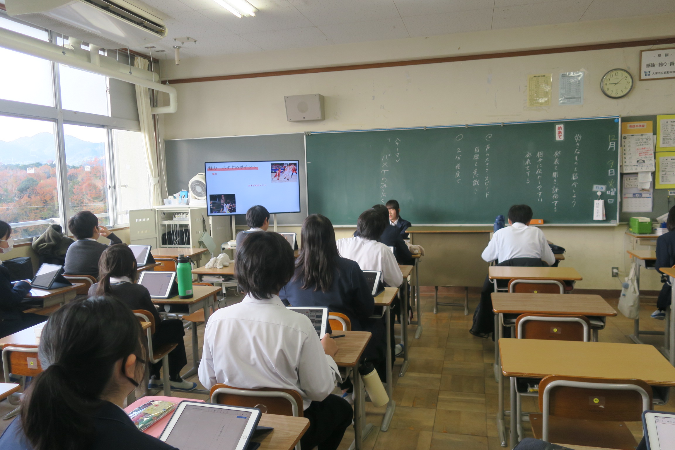 1年3組は国語の授業でした。テーマは「プレゼンテーション」。『自分の好きなもの、好きなこと』を「〜の魅力」として仲間に紹介する活動です。「みかんの魅力」「バスケットボールの魅力」など、身近な題材を工夫して発表していました。聴き手は発表を聞いた感想や評価を記入し、互いに学び合う姿勢が見られました。自分の好きなことを言葉で伝える難しさと楽しさを体験しながら、表現力を磨いていました。