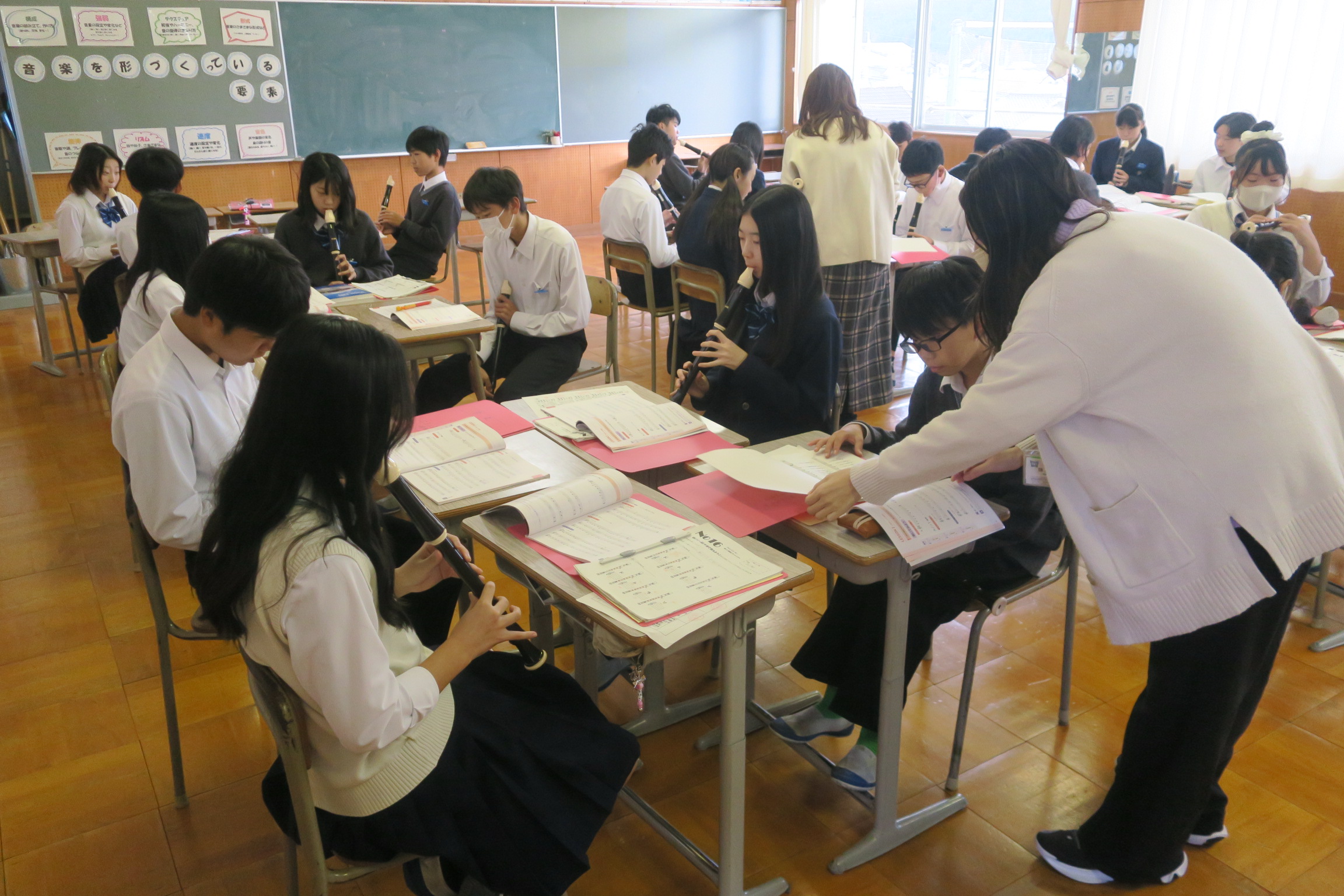 1年2組は音楽の授業でした。グループに分かれてアルトリコーダーの練習をしていました。曲は「オーラリー」。それぞれのペースで音を確かめながら練習を進め、グループごとに協力し合う姿が印象的でした。