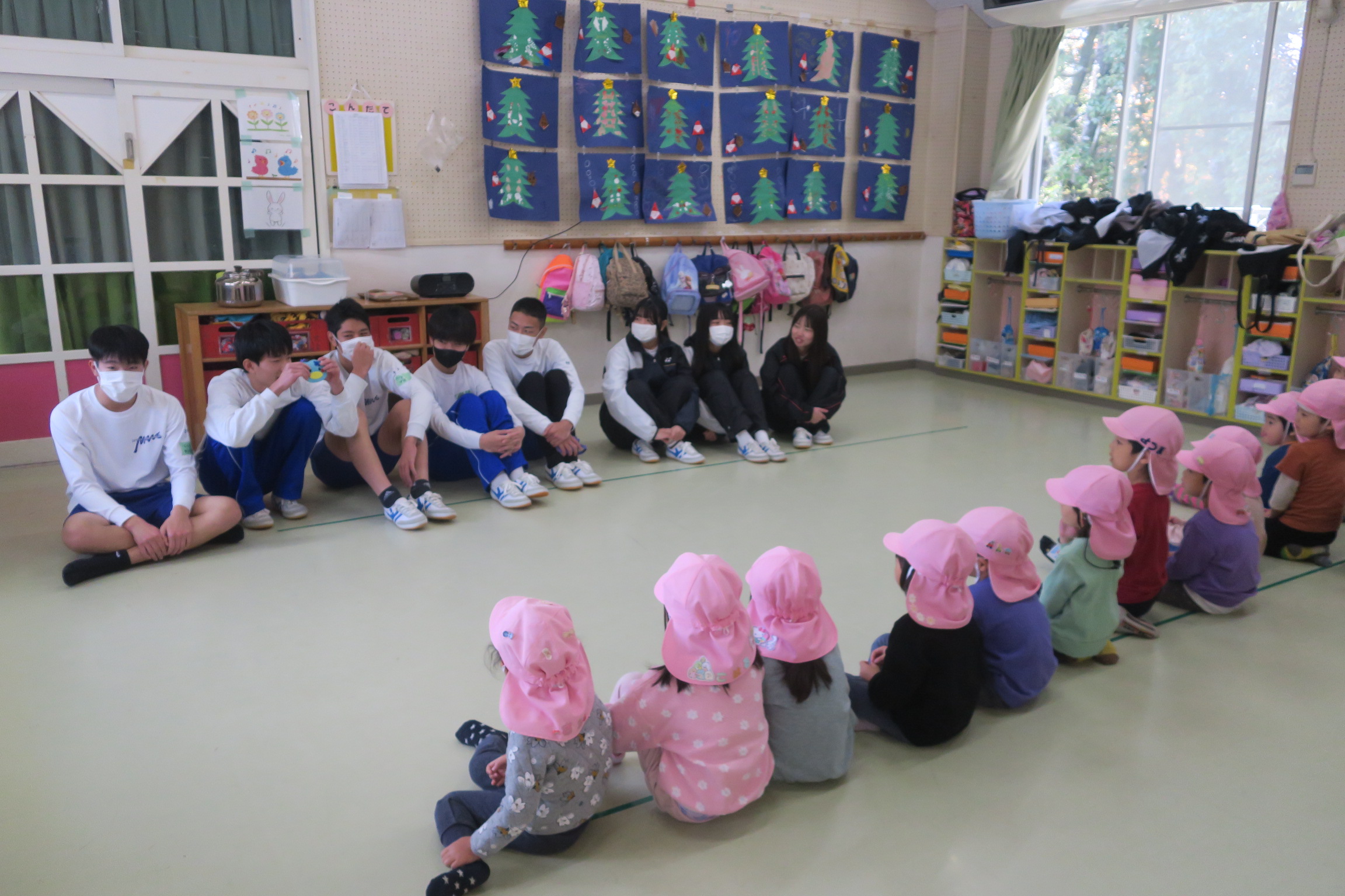 昨日から真野保育園で「幼児ふれあい体験」が始まりました。事前学習として名札づくりをしたり、保育について学んだりと準備を整え、いよいよ園児との交流を迎えました。今日はは3年1組が体験を行いました。園児は2歳児、3歳児、4歳児、5歳児のクラスに分かれており、3年生はそれぞれのグループに入り活動をしました。まずは室内で自己紹介をしてから、椅子とりゲームや電車ゲームをして交流を深めました。初めはぎこちなさもありましたが、ゲームを通して笑顔が広がり、園児と3年生の距離がぐっと近づいていきました。