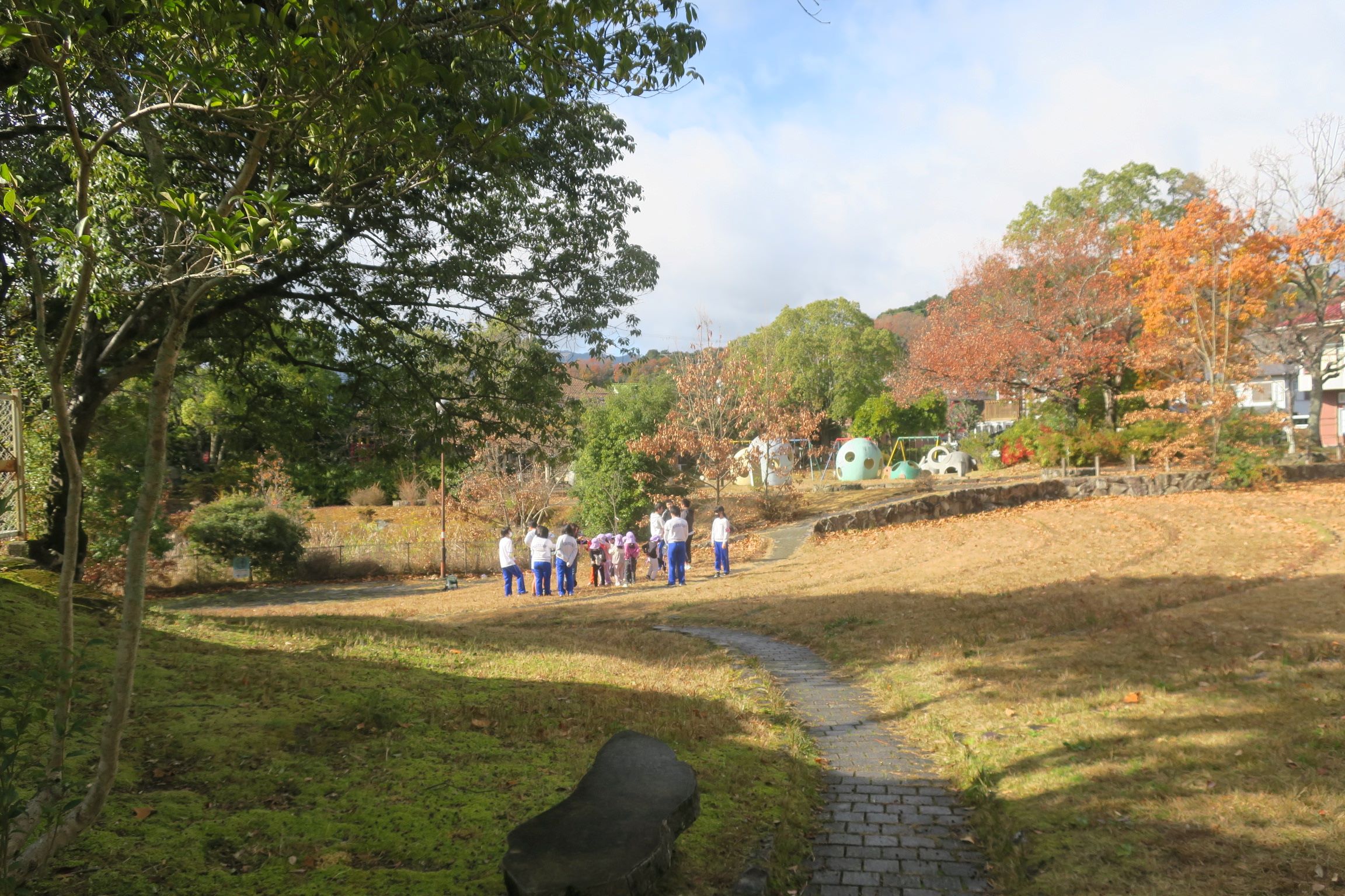天気が回復したので、園庭や公園でも活動を行いました。しっぽ取り鬼ごっこやドッジボール、ジャングルジムなどの外遊びを一緒に楽しみました。園児の安全を見守りながら、時には一緒に走り回り、時には手を取り合って遊ぶ姿が見られました。給食の時間には食べさせてあげる場面もあり、園児にとっては「お兄さん・お姉さん」と過ごす特別な時間になったようです。