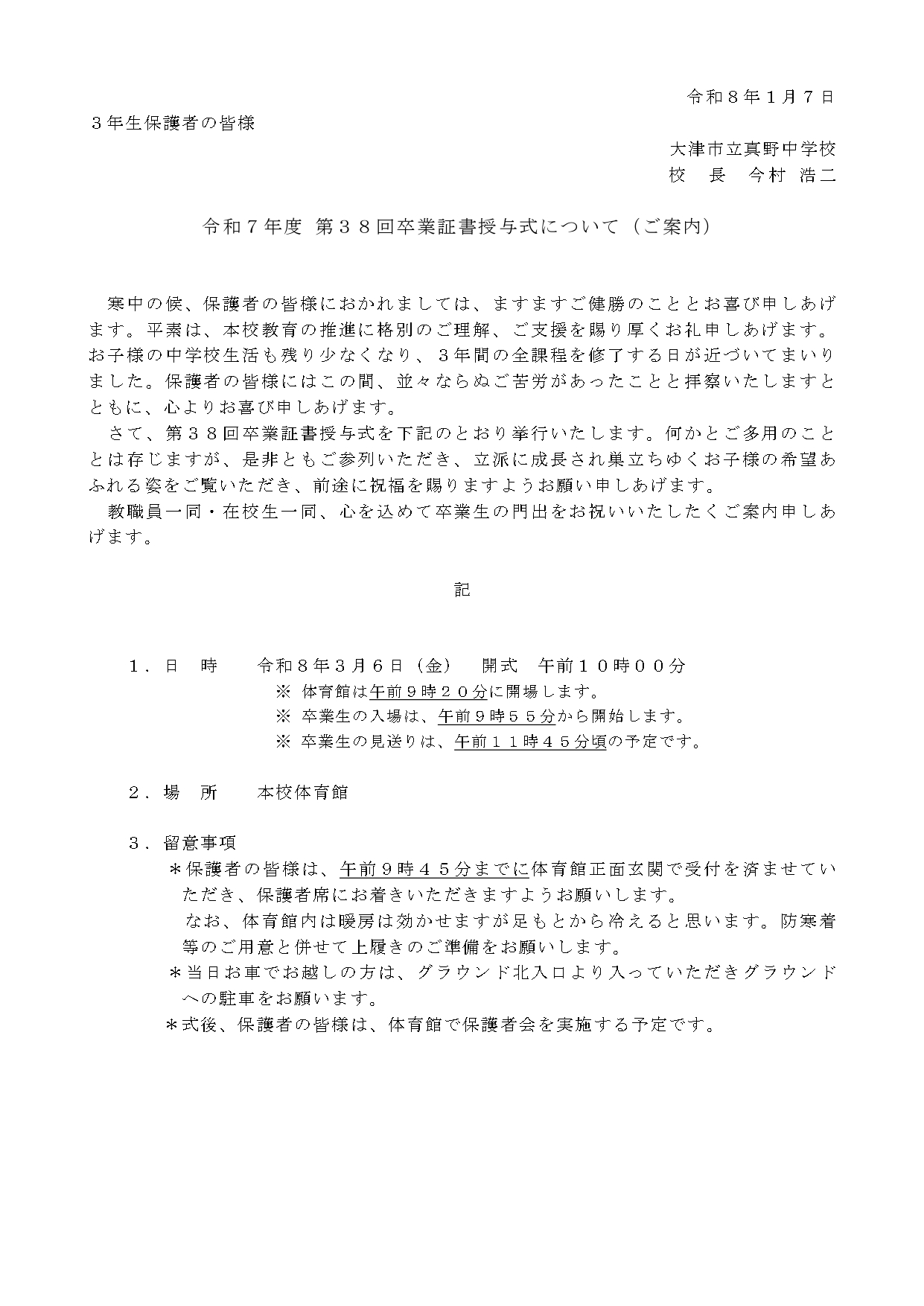 本日、予定通り令和7年度第38回卒業証書授与式をおこないます。午前10時開式です。体育館は午前9時20分に開場します。本校、体育館でおこないます。卒業生の入場は午前9時55分から開始します。卒業生の見送りは、午前11時45分頃の予定です。本校体育館です。保護者の皆様は、午前9時45分までに体育館正面玄関で受付を済ませていただき、保護者席にお着きいただきますようお願いします。