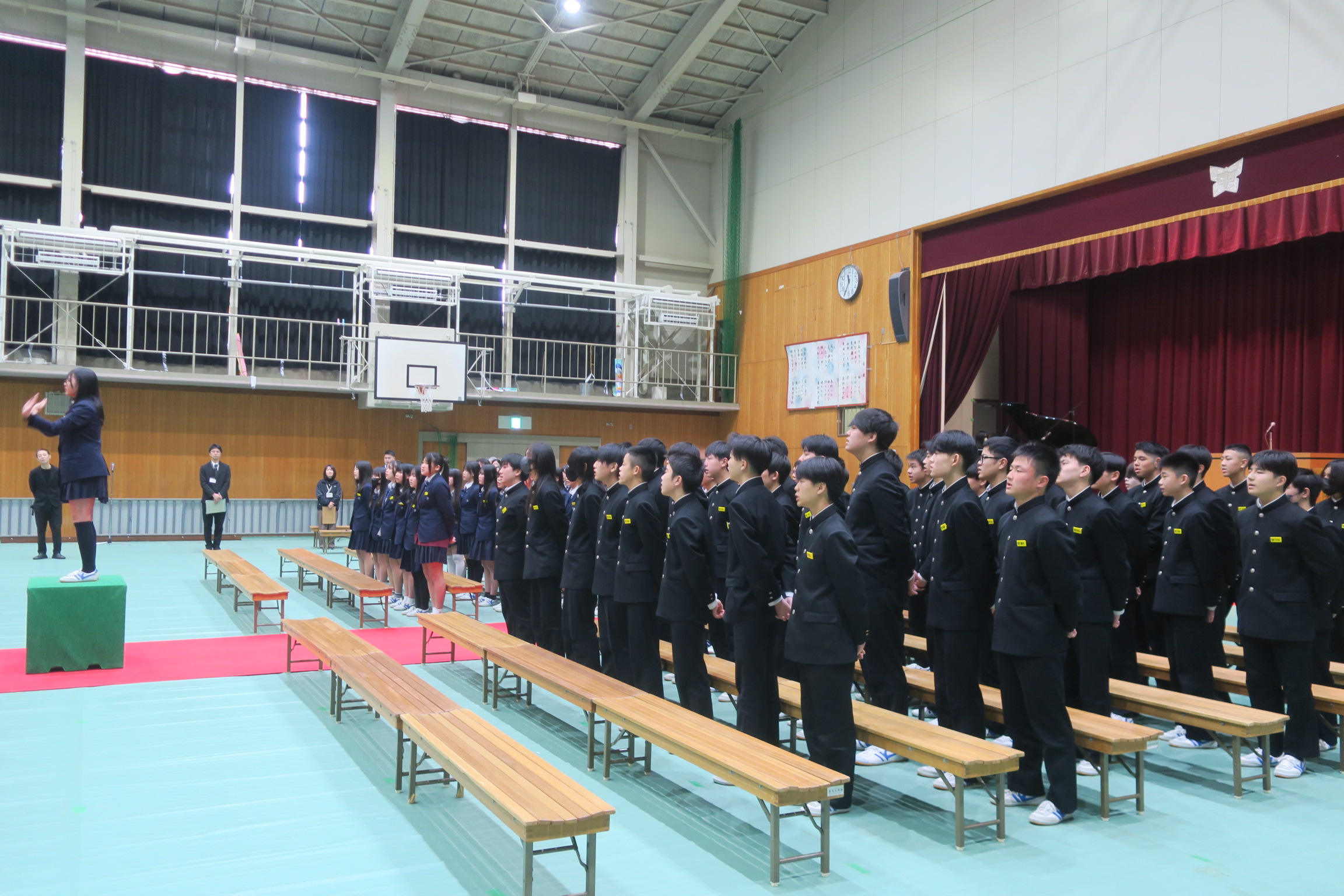 今日の3・4時間目に、明日の卒業式に向けた予行練習を行いました。当日の流れに沿って、3年生の入場から練習が始まりました。入場の後、開式のことば、国歌斉唱、卒業証書授与、校長式辞、来賓紹介・祝電披露、送辞、卒業生の歌と答辞、全校合唱「旅立ちの日に」、閉式のことば、そして3年生退場へと続きました。3年生は終始集中しており、一つひとつの動きがそろい、良い緊張感が体育館全体に漂っていました。3年生の姿を見た1・2年生も、引き締まった表情で予行に臨んでいました。3年生が歌う『正解』は、昨日よりもさらに完成度が高まり、力強さと美しさが増していました。「校歌」も「旅立ちの日に」も、3学年がそろって歌うと体育館に響き渡る大きなボリュームとなり、心に残る歌声でした。