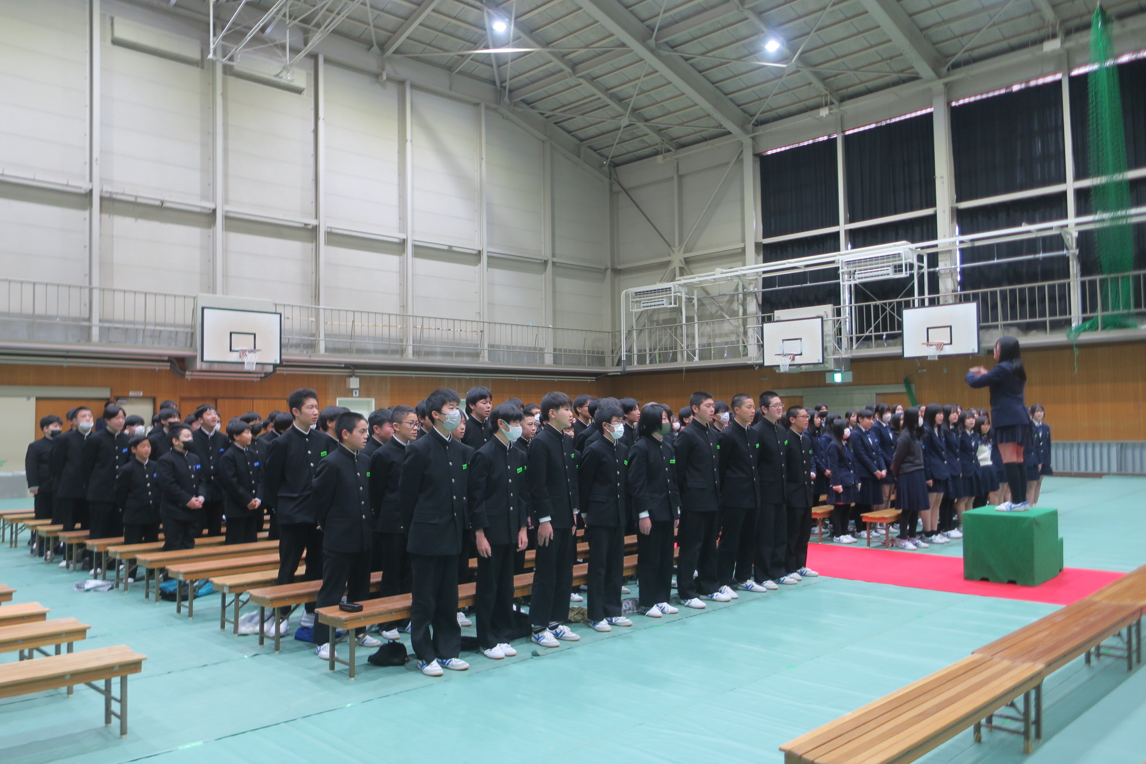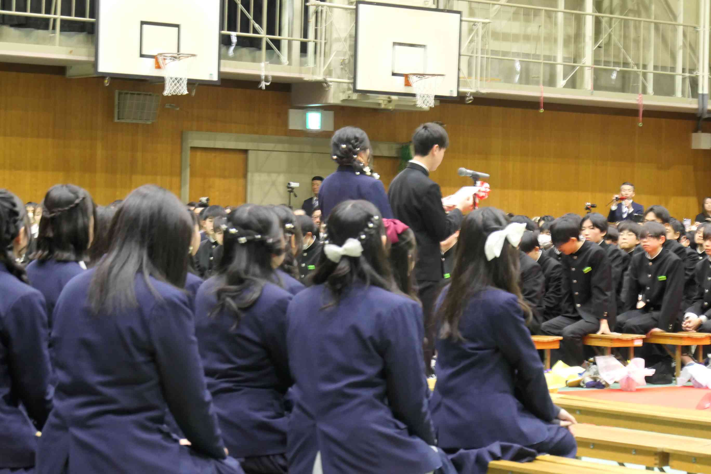 最後は式歌合唱「旅立ちの日に」。3年生の迫力ある歌声、それに負けないぐらい1・2年生も3年生への感謝の思いを込めて歌いました。先輩の頼もしい立派な背中を1・2年生にしっかり見せてくれました。
