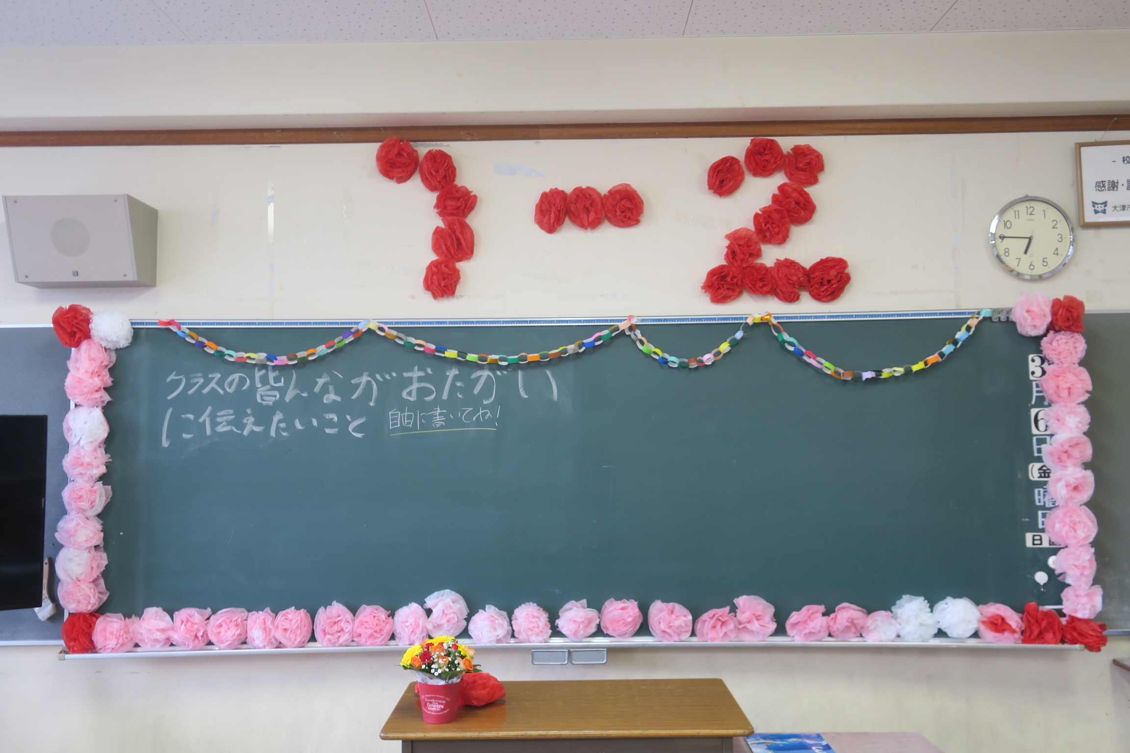 今日の予行練習、1・2年生も良い緊張感をもって取り組みました。3年生の退場後歌練習があり横野時頼もさらにレベルアップしました。明日の卒業式が楽しみです。1・2年生は卒業式に向けて教室に飾る花づくりをしてくれました。2年生を中心に式場準備にも取り組んでいます。3年生への感謝の気持ちを心で表してくれています。