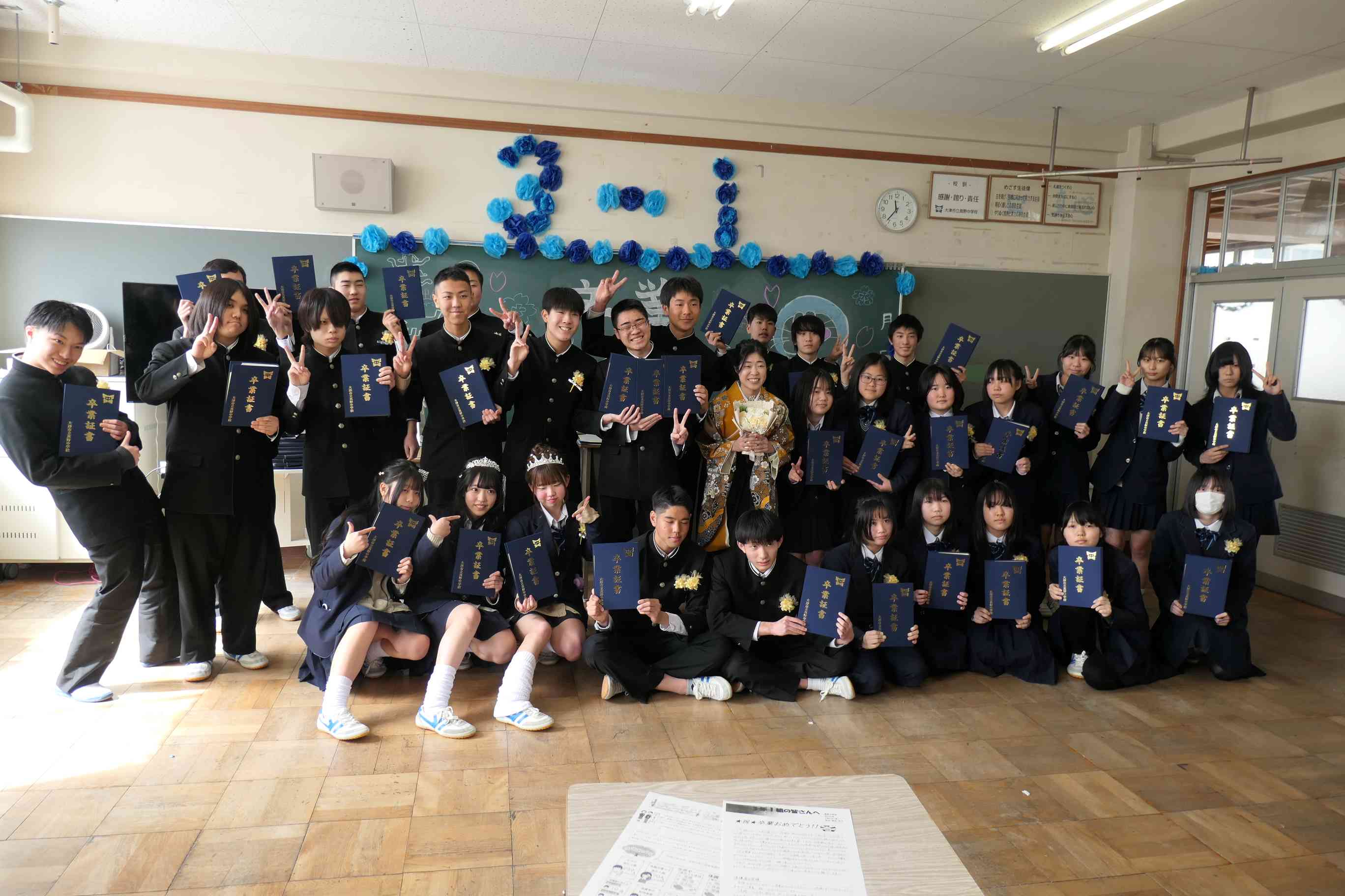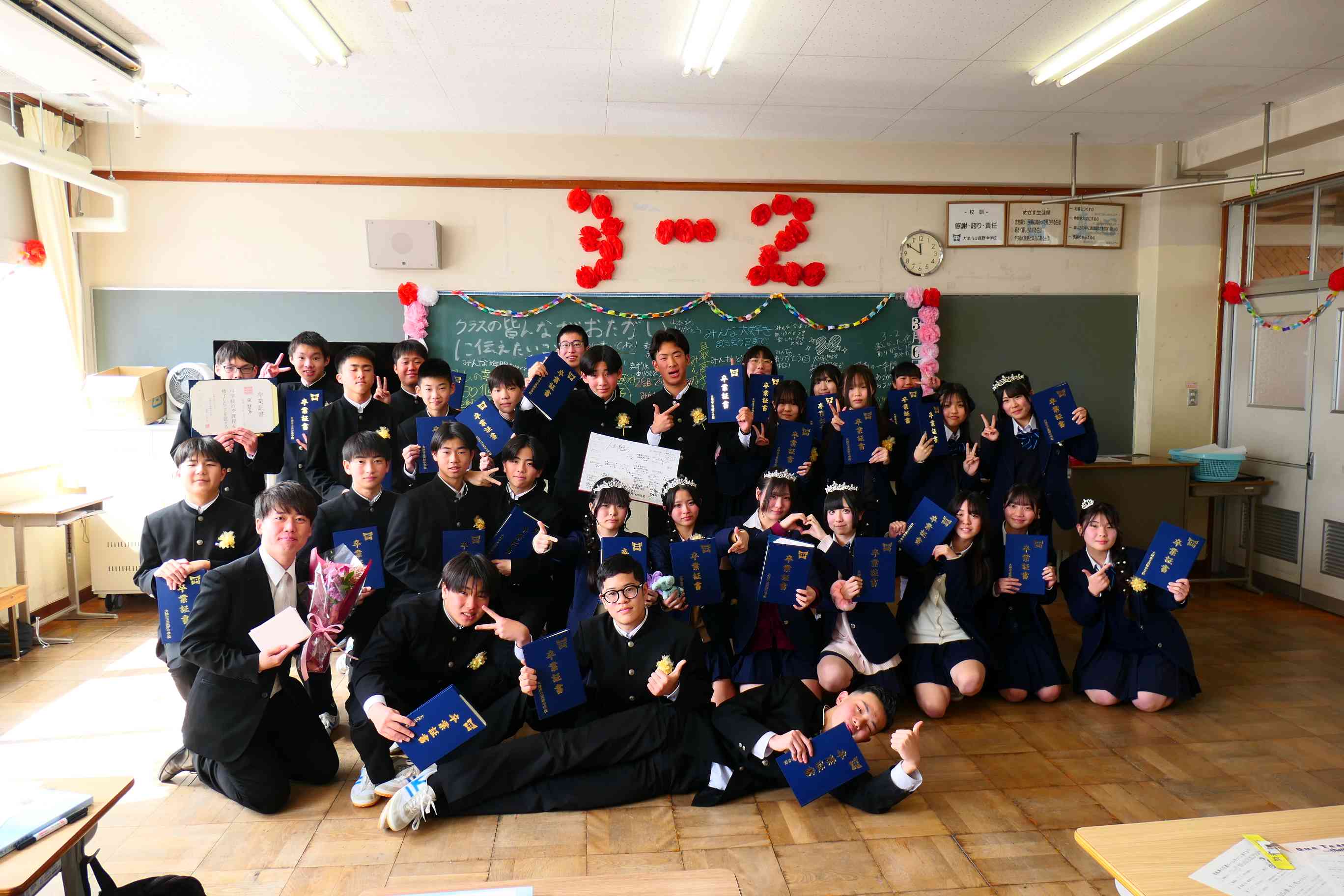 卒業式の後はクラスに戻り最後の学活でした。卒業式中から涙があふれている人が多く、教室に戻ると第号泣する姿がたくさんありました。 学活では担任の先生から卒業証書を受け取りました。そして、担任の先生から最後のメッセージにも涙があふれていました。続いて、クラスでの卒業セレモニー。仲間や担任の先生との別れを惜しむ涙がたくさんあふれていました。最後は笑顔でクラス写真。そして、1・2年生が花道をつくり卒業生を温かく送り出してくれました。生徒昇降口では担任の先生、3年生の先生に感謝の気持ちを伝える3年生には涙と笑顔が入りまじっていました。晴れやかな笑顔で未来に向けて真野中学校を巣立っていきました。