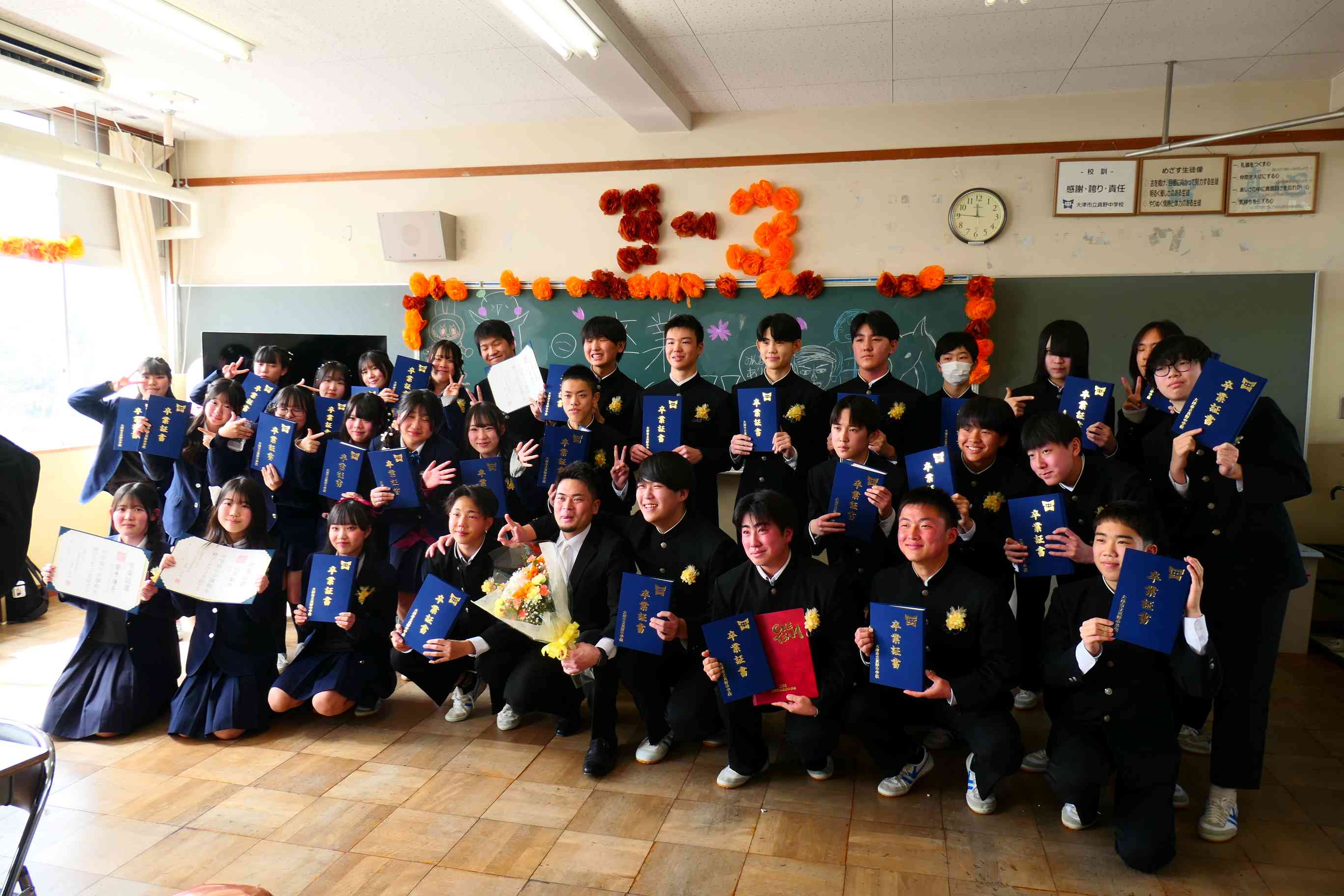 3年生のみなさん、卒業おめでとう。心に残る最高の卒業式になりました。しばらくはエネルギーをチャージをして、体と心をゆっくり休めて、4月から始まる新しい生活に備えてください。頑張りすぎず、無理をせず、ぼちぼちいこう。しんどくなったら、いつでも真野中学校に立ち寄ってください。