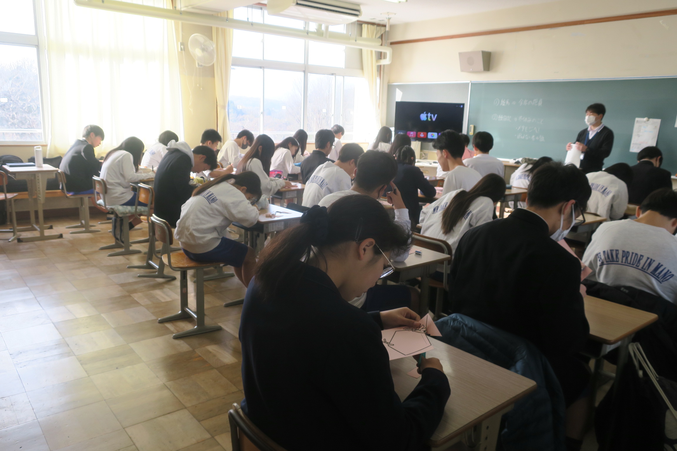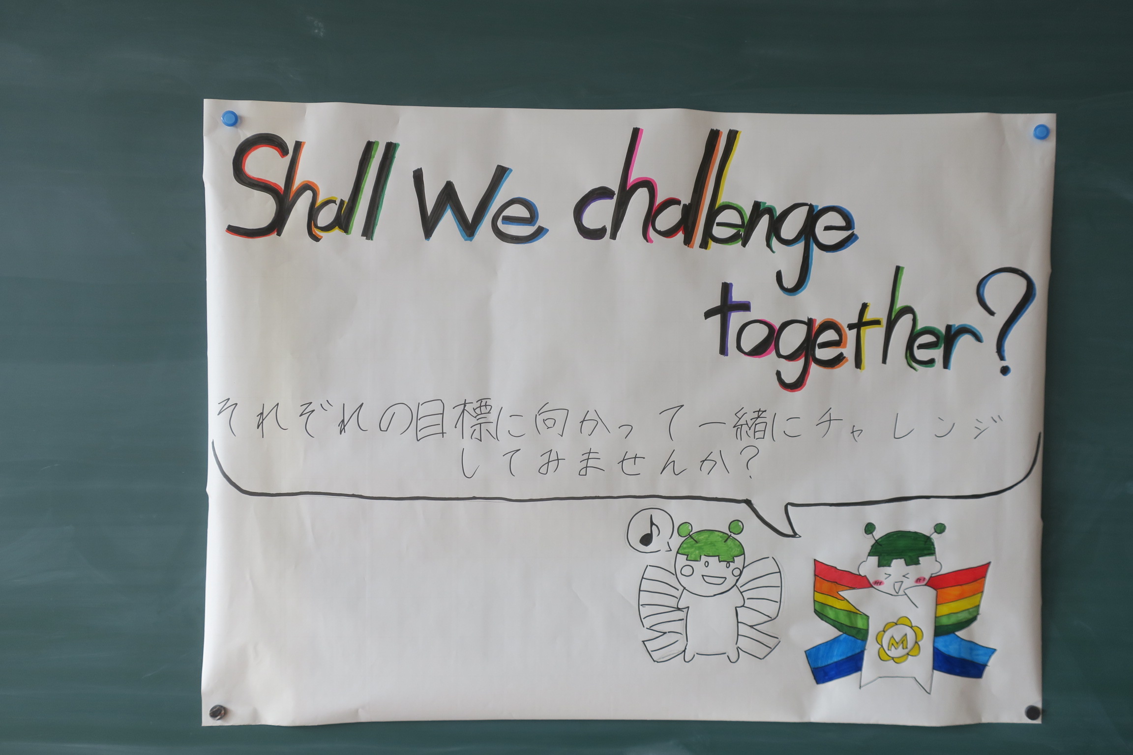 12月24日に生徒会リーダー研修会がおこなわれました。その中で第38期生徒会の活動方針、スローガンが決定されました。昨日の始業式で生徒会長から内容が発表されました。スローガンは「Shall We challenge together」です。立場や学年を越えて手を取り合い、新しい一歩にみんなで挑戦していこうという思いが込められています。