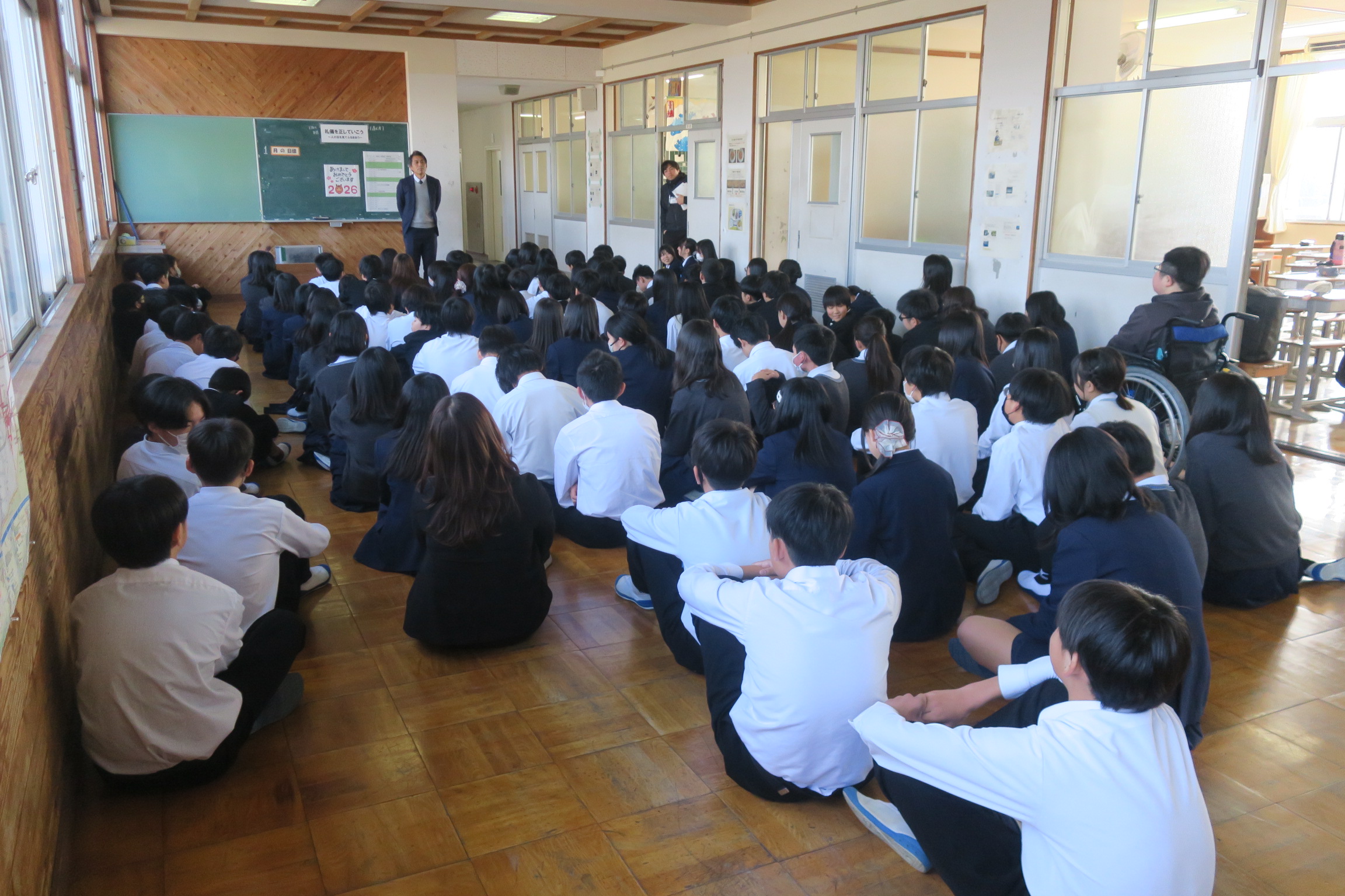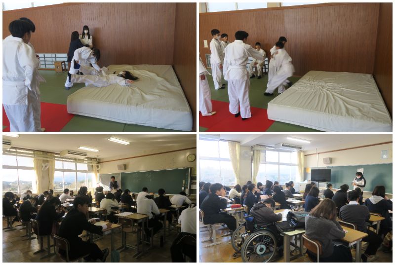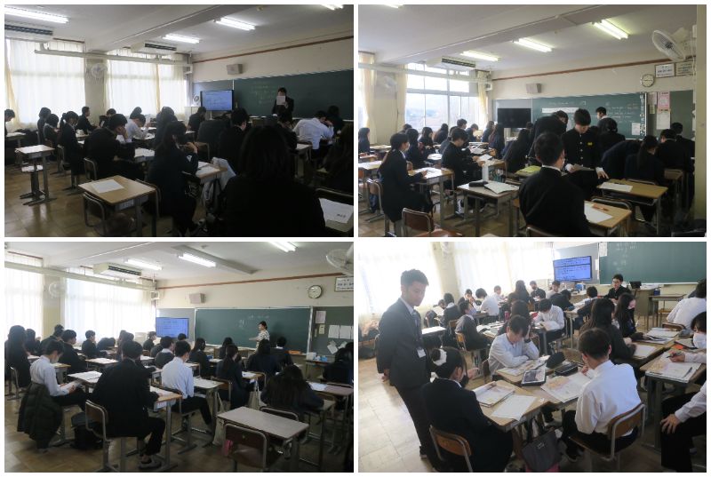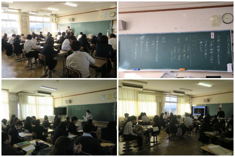 今日から3学期の教科の授業がスタートしました。3年生は6日に実施した実力テストの返却がありました。先生の解説に集中して耳を傾けていました。2年生は1組が体育の授業でした。内容は柔道でした。マットを使い2人組で払い腰の練習をしていました。2年2組は国語の授業でした。漢文の学習でした。レ点、一二点、上下点など漢詩の読み方のルールの確認をしていました。2年3組は理科の授業でした。冬休みの仮題プリントの答え合わせをしていました。