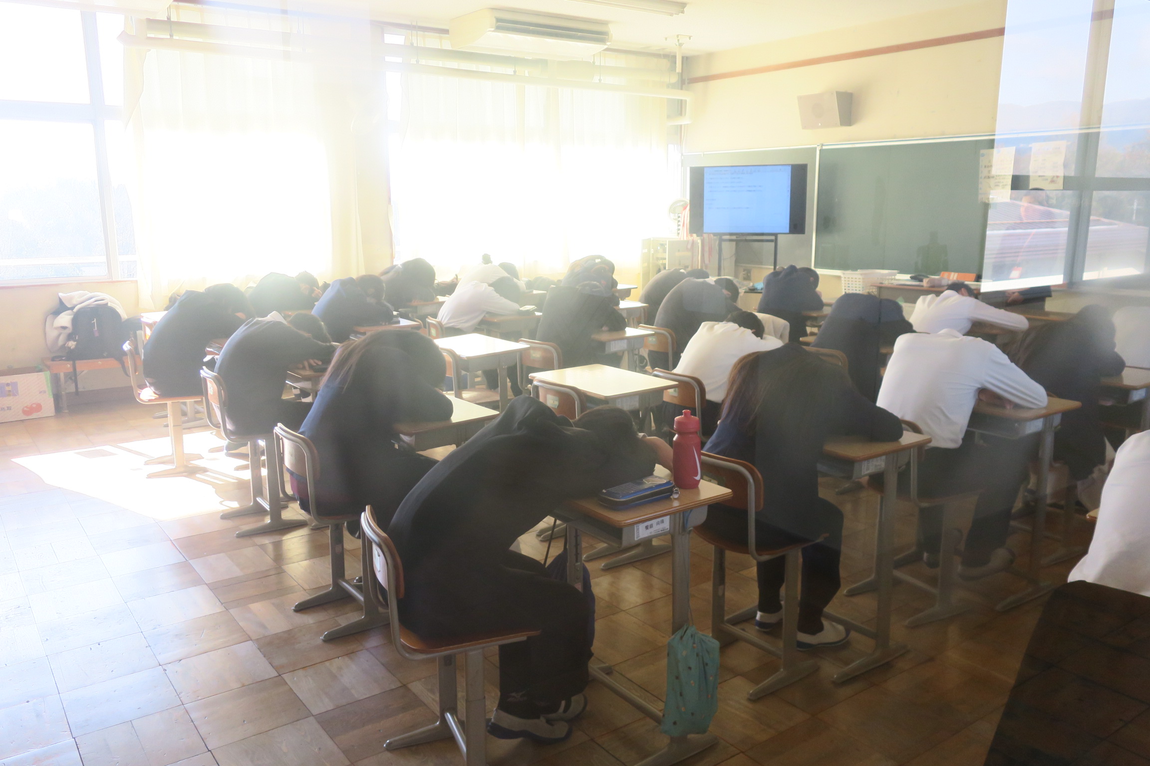 今日の4時間目に不審者対応の避難訓練をおこないました。実際に発生した事件を取り上げながら各クラスで不審者対応についての資料を見て説明を聞きました。その説明をしっかり理解できたかを確認するために放送を入れ避難の練習をしました。みんなスピーディに避難をして静かにして待機していました。机の下に隠れて気配を全く感じさせないクラスもありました。