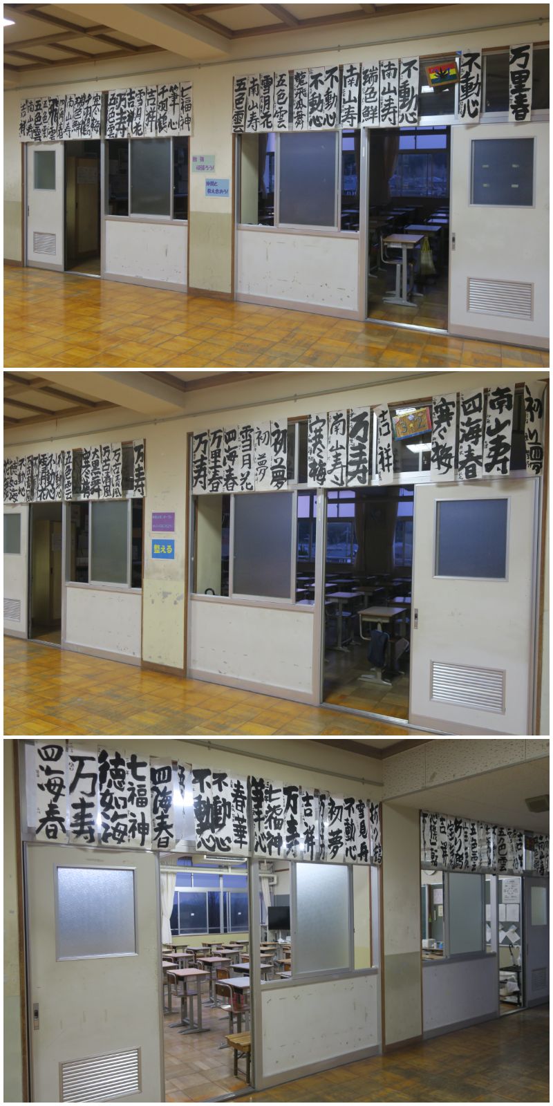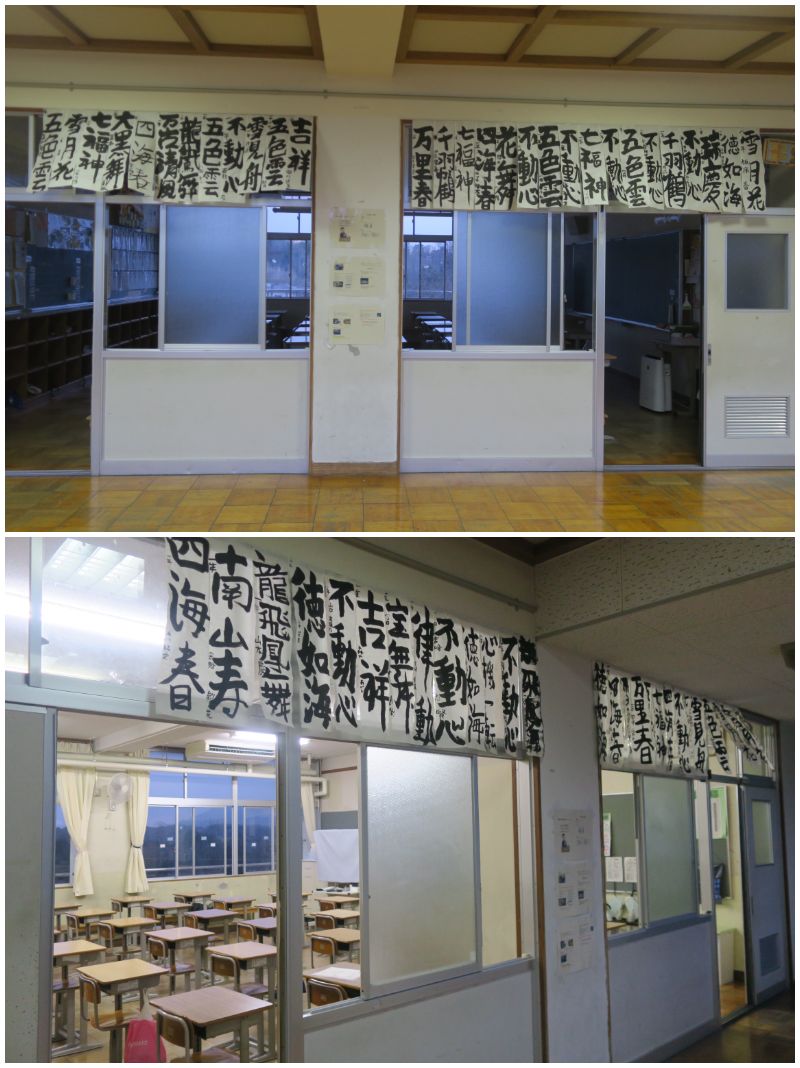 各教室の廊下側に書き初めが掲示してあります。2学期の書写の時間に練習を重ねて自分の一番良い作品を掲示してあります。どの作品も生徒一人ひとりが思いを込めて書いた作品です。すべての作品を国語科の先生が厳正な審査を行い、優秀な作品は大津市書写作品展に出品されます。