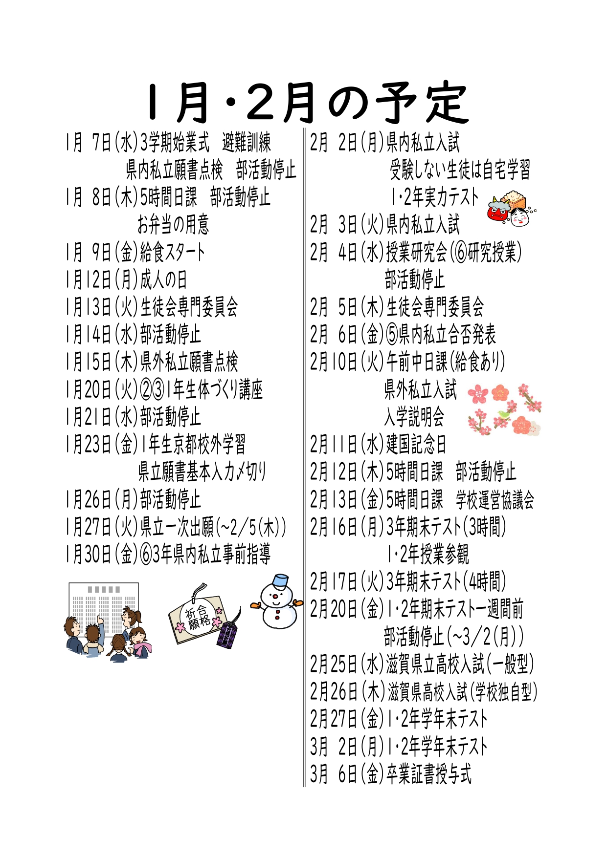 3学期がスタートしました。1月は行く、2月は逃げる、3月は去ると言われるように、3学期は時間の流れがとても早くなります。見通しをもって1日1日を大切に過ごしましょう。1月の予定です。