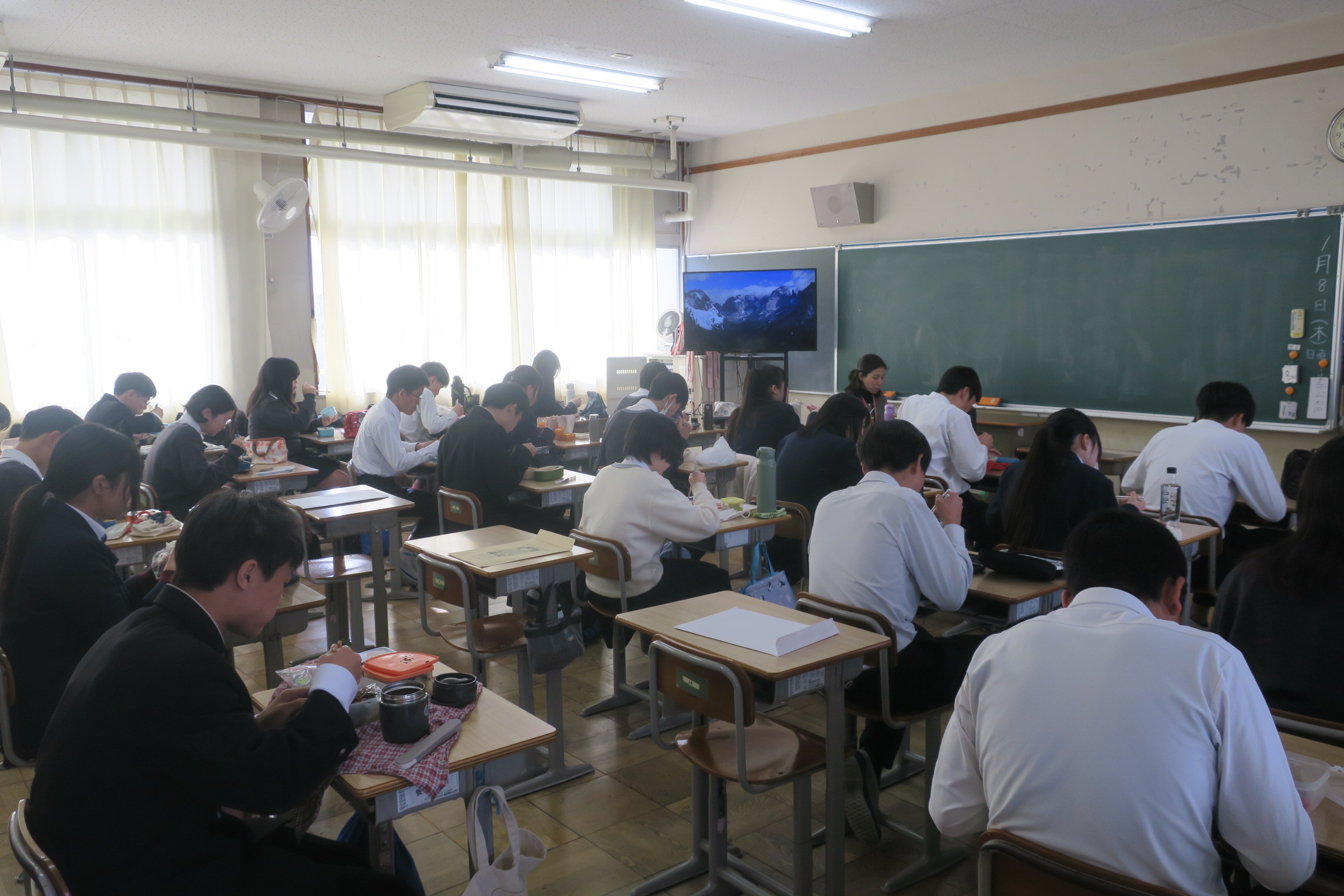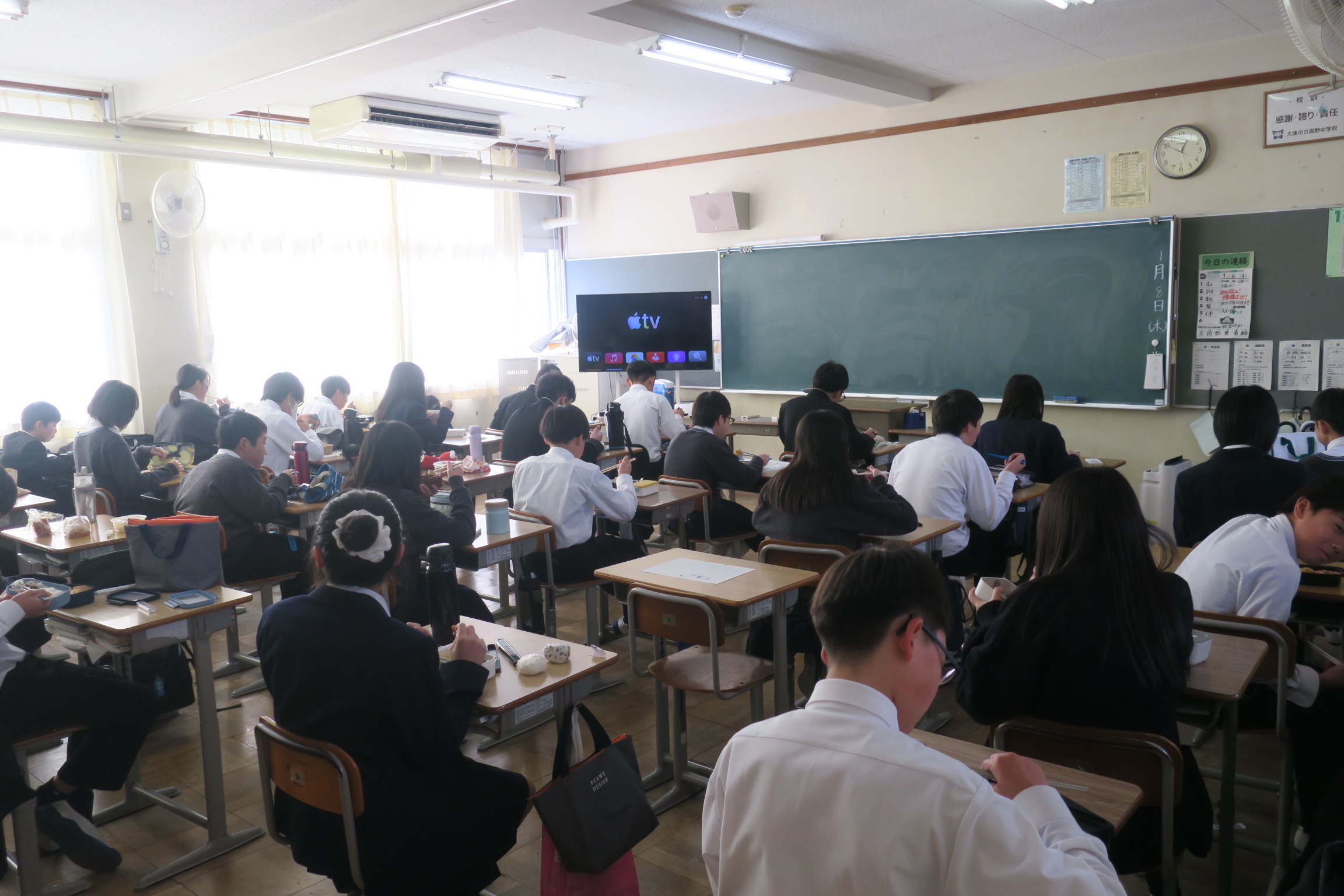 明日1月8日(木)は5時間日課です。地域の会議があるため部活停止です。完全下校は15時です。明日は給食はありません。お昼の用意が必要です。よろしくお願いします。
