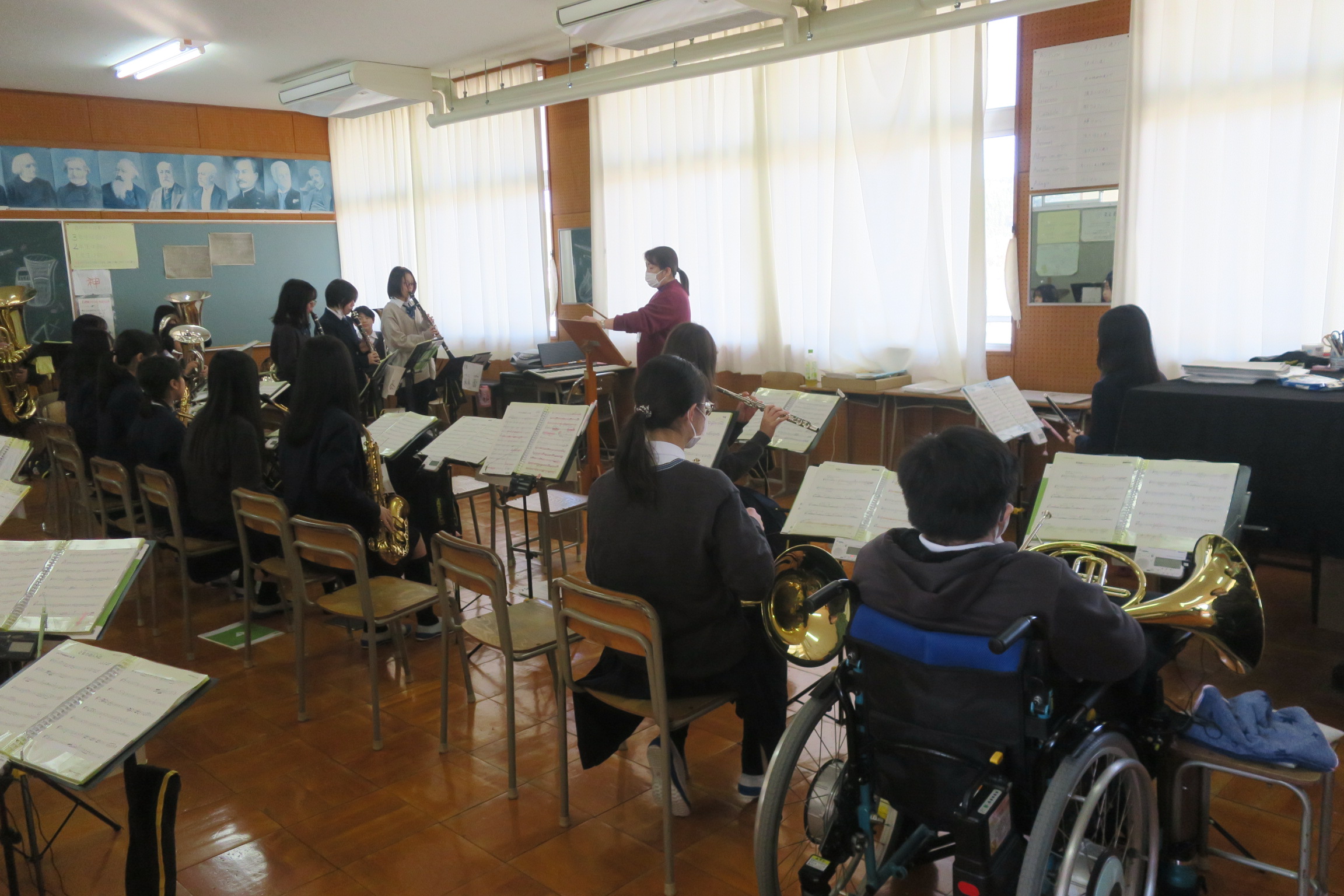 今日は吹奏楽部のクリスマスコンサートが10時30分からおこなわれます。アンサンブルの発表と合奏が演奏されます。日頃の練習の成果を、是非聴きに来てください。駐車場を確保していますので、お車で来校ください。