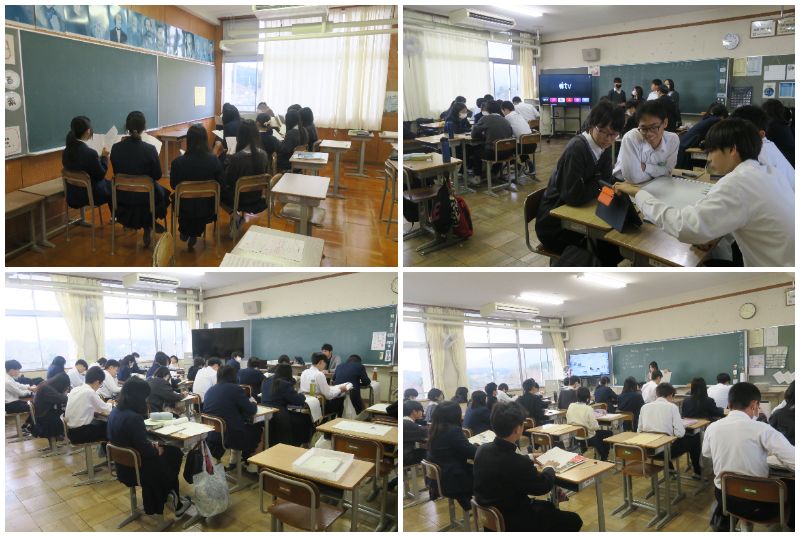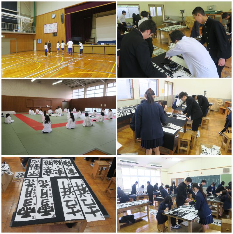 3年1組は書道の授業で、画仙紙に納得いくまで筆を走らせていました。3年3組は音楽の授業で、卒業式に向けて卒業生の歌の練習に取り組んでおり、今日は「群青」を歌っていました。しんみりしました。