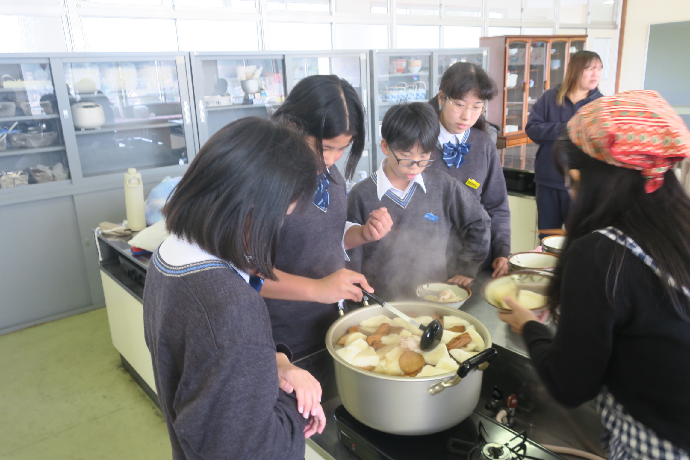 5組は調理実習で、レインボーファームで収穫した大根を使ったおでんづくりに取り組んでいます。日頃お世話になっている地域のみなさん(よったり軍団のみなさん)を招待します。
