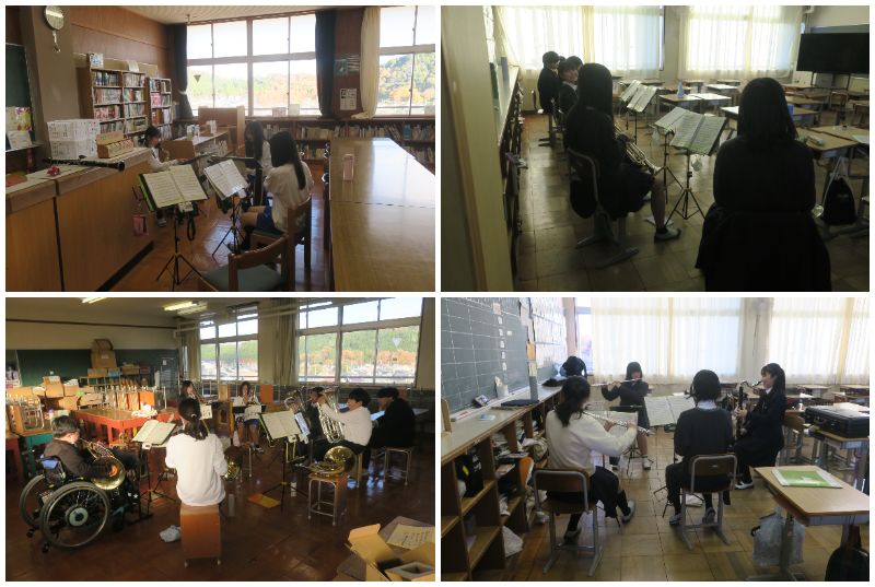 校舎内では吹奏楽部が、明日に向けたアンサンブルコンテスト校内予選に向けてパートごとに練習を重ねていました。生徒たちは真剣な表情で、気持ちを込めて演奏に取り組んでいました。