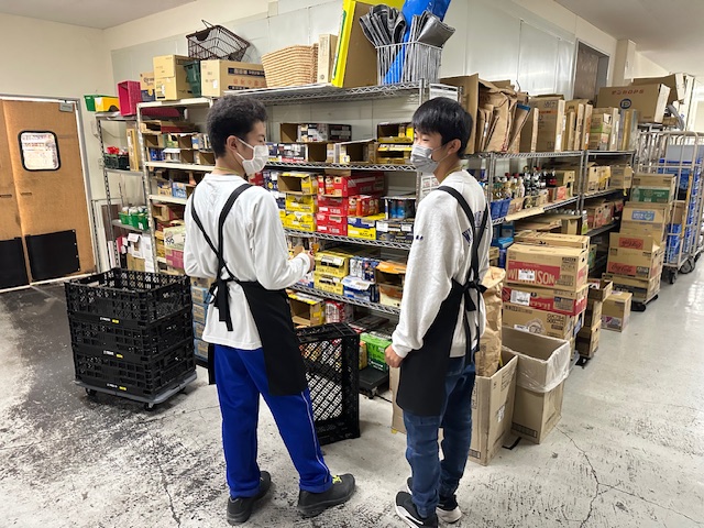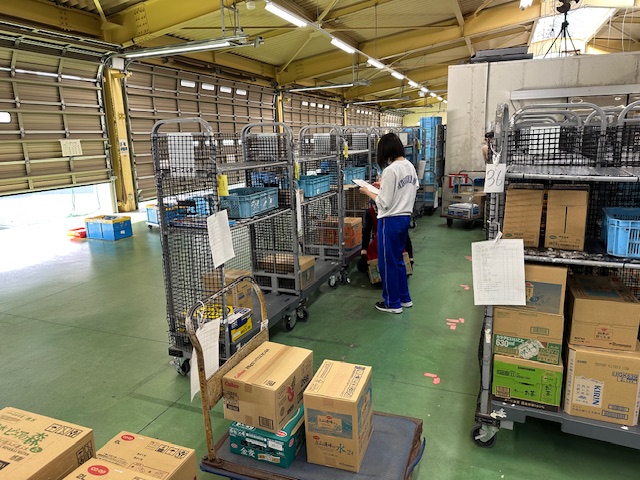 商品の仕分けや配送の準備とを体験している真野中生もいます。運ばれてくる商品の運搬、配送する商品の仕分けをテキパキと行っていました。「積極的でとてもありがたい」と話されていました。