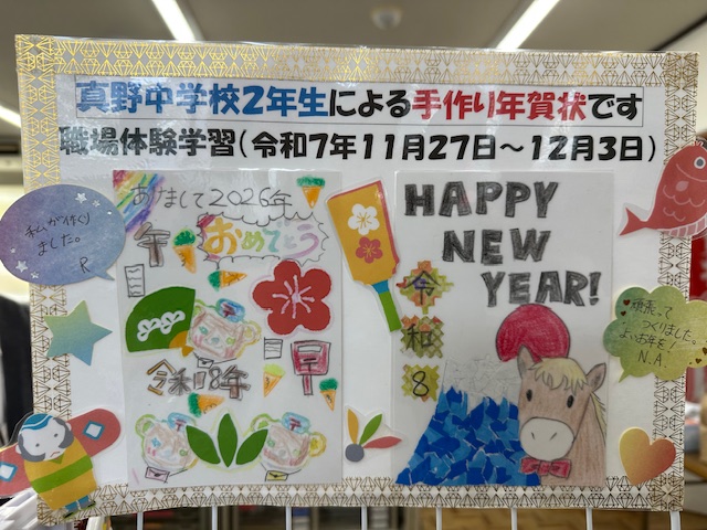 2年生は職場体験学習3日目です。今日から3日間、後半の体験になります。2日間で仕事にも少し慣れて積極的に取り組む姿が多く見られました。郵便局では自作の手書きの年賀状づくりやはんこ押し、チラシ折りなどの作業に取り組んでいました。自作の年賀状はかわいらしい出来映えで窓口に貼られていました。