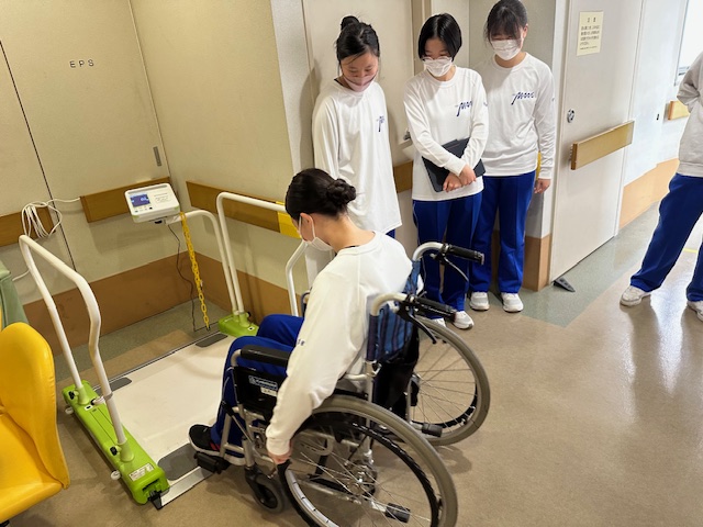 病院では様々な体験をさせてもらっています。今日の午後からは車いすを利用する人の立場になって車いすの操作体験をしました。体重計に車いすを入れる体験でした。結構難しそうでした。スーパーでは品出しを行っているところでした。商品をどこに並べたらいいか少し悩む場面も見られました。少しずつですが仕事が様になってきました。